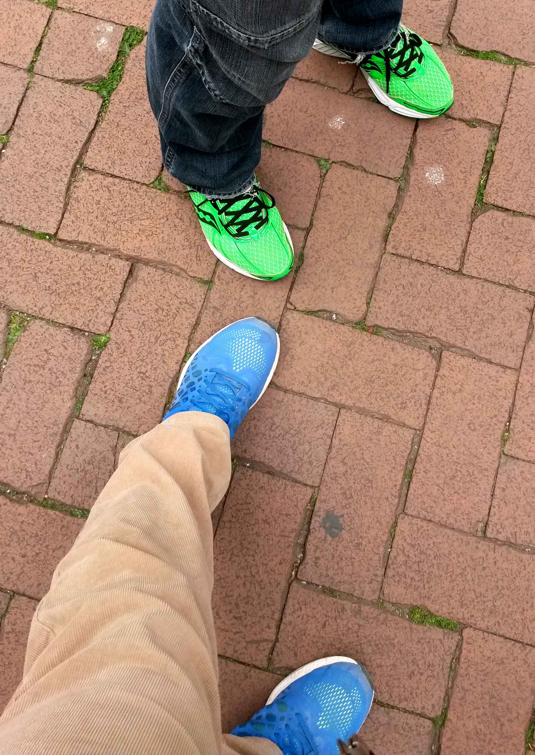 “Hast Du Dir mal unsere Schuhe angeguckt?“ Das hatte einerseits was tröstliches. Andererseits ist es aber insofern rollentheoretisch interessant, als er damit das Klischee antizipierte und augenzwinkernd konterkarierte, dass Männer, die Stil und Geschmack besitzen, eigentlich nur schwul sein können. Gut, dass ich meine gelben Laufschuhe nicht anhatte. Was hätten die wohl für Signale ausgesendet!? Die beiden abgebildeten Paare sind übrigens nicht nur unserem Verständnis von Ästhetik geschuldet, sondern absolut funktionale Hochleistungstreter, mit denen man aus dem Stand einen Marathon unter 3 Stunden läuft. Beinahe jedenfalls.