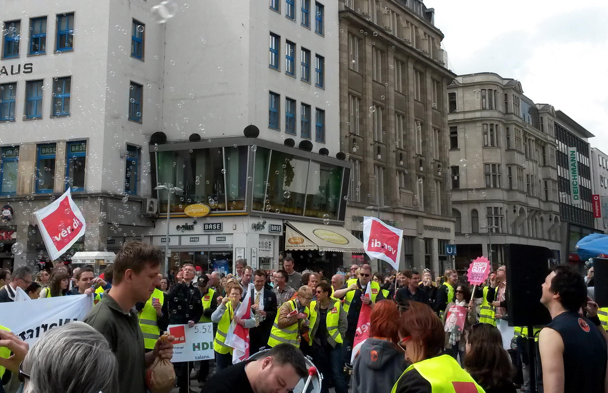 Am 13.05. fand eine ver.di Streikaktion von Beschäftigten der Versicherungsbranche in der City von Hannover statt und ich durfte die Kolleginnen mit einer kleinen Satire-Intervention unterhalten. Die Branche verdient sich sowohl dumm als auch dämlich, allein die Allianz AG hatte in letzten Jahr einen Reingewinn von 10 Milliarden Euro. Trotzdem werden immer mehr Arbeitsplätze abgebaut, der Rationalisierungsdruck steigt und als Angebot haben die Arbeitgeber für diese Tarifrunde lächerliche 0,8 Prozent angeboten. 0,8 Promille wären da weniger zynisch gewesen. Das hat sogar die nicht gerade extrem streikfreudigen Versicherungskolleginnen zu Hunderten in die City von Hannover getrieben und ich gab dort also den satirischen Heino Boss, Vorstandschef der Brillianz AG. Dazu hatte ich meinen Smoking an und wartete unter den Streikenden auf meinen Auftritt, nach den Reden. Die kannten mich nicht, wussten nicht, was auf sie zu kam und tuschelten ob meiner scheinbaren Andersartigkeit: „ …..vielleicht Arbeitgeberpräsident tuschel tuschel.“ Soweit hatte ich das Getuschel verstanden, fixierte die Flüsternden nebenan scharf und bellte in bestem Kasernenhofton: „Jawoll, und Chef hört alles.“ Schweigen. Nebenan baute sich ein notorischer Pöbler auf, Rentner, formte seine Hände zur Flüstertüte und bölkte: „Faules Gesindel, geht gefälligst arbeiten!“ Ob er das auch auf Nazidemos macht? Ich musste lachen, bei dem Vorwurf an Leute, die sich auf grund extremer Leistungsverdichtung die Seele aus dem Leib arbeiten. So was nenn ich gelungenes Warming-up.