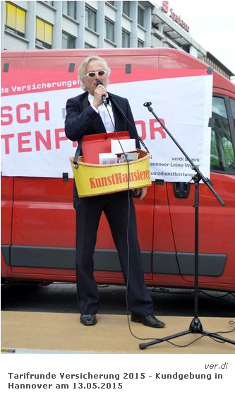 ver.di Streikaktion Versicherungsbranche in Hannover am 13.05.2015 . Paar Hundert Kolleginnen, die sich für höhere Löhne einsetzten und ich war für den kulturellen Rahmenbeitrag gebucht. Hab als KunstHausierer die Leute bisschen mit einem Satirequiz mit Preisen zur Tarifrunde aus dem Bauchladen und ähnlichem „bespaßt“. Kam gut an, hat mir auch Spaß gemacht. Bis zu dem Zeitpunkt, wo mir beim Einsortieren des Bildes ins Archiv einfiel, was vor Jahren mal der „kritische“ Hintergrund zur Entwicklung der Figur des „KunstHausierer“ war und was, auch bei mir, im Rahmen zahlreicher öffentlicher Aktionen und Auftritte mittlerweile komplett untergegangen ist. Es ist halt irgendwie ein Walk act oder Comedy, Bespaßung eben, bei der ich fast nie dazu komme, auf den Hintergrund einzugehen.