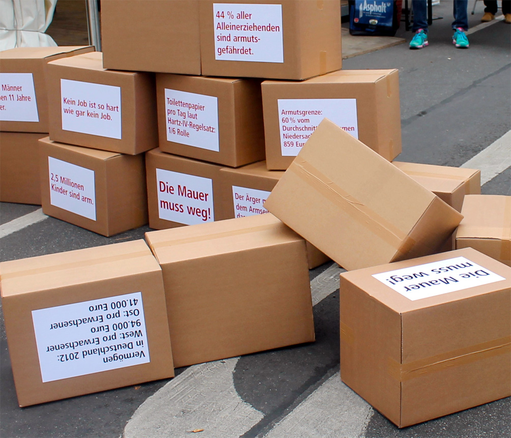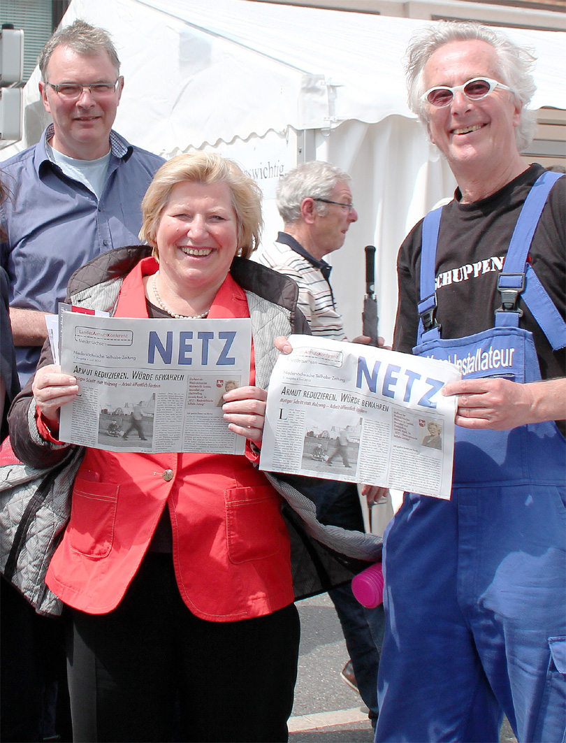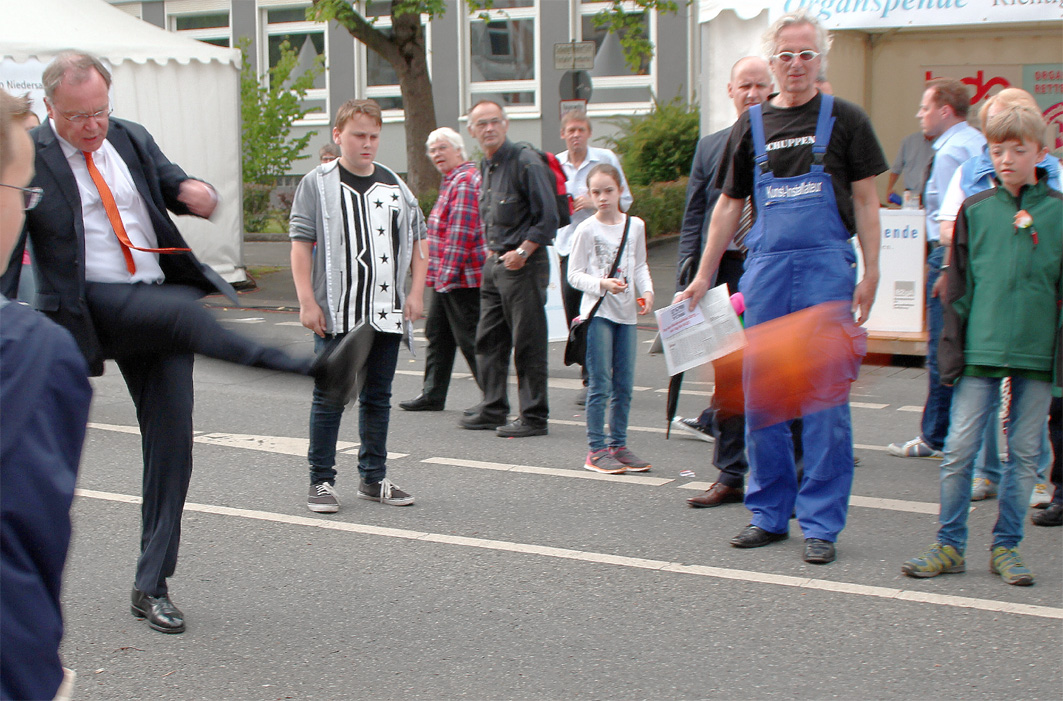 Sozialministerin Rundt mit der NETZ an unserem Zelt beim Tag der Niedersachsen. Abgesehen davon, dass ich unter anderem dafür bezahlt werde, so was zu organisieren, bleibt die Frage: Was bringt das? Was bringt es, bei so einem Bier- und Erbsensuppe-Event mit 320.000 Besucherinnen Kunst & Kultur zum Thema „Spaltung der Gesellschaft“ zu präsentieren? Was bringt es, Politprominenz zu so einem Fototermin inklusive 10 Minuten (Fach) Gespräch ans Zelt zu kriegen? Gute Frage. Es gab ein paar Reaktionen, an denen wir merkten, die Arbeit war nicht umsonst. Aufklärung im besten Sinne. Es war ein angenehmes Gefühl zu wissen, dass wir das einzige Zelt waren, dass mit einem unangenehmen Thema der bierseligen Partylaune unterhaltsam in die Erbsensuppe gespuckt hat. Und es gab schöne und lustige Momente, wie den, wo der Ministerpräsident mit einem Schuss die Mauer zwischen Arm und Reich fällte.