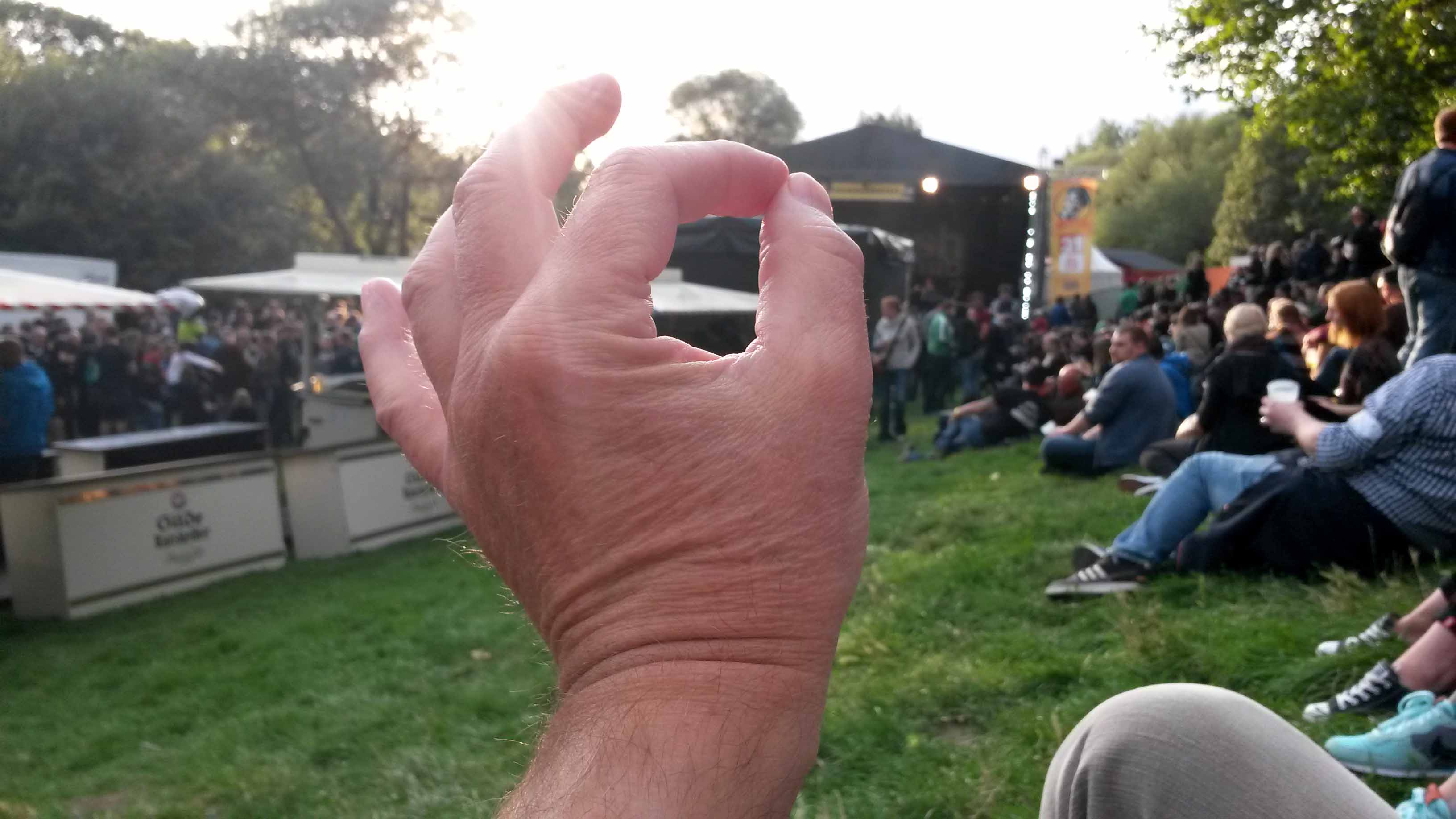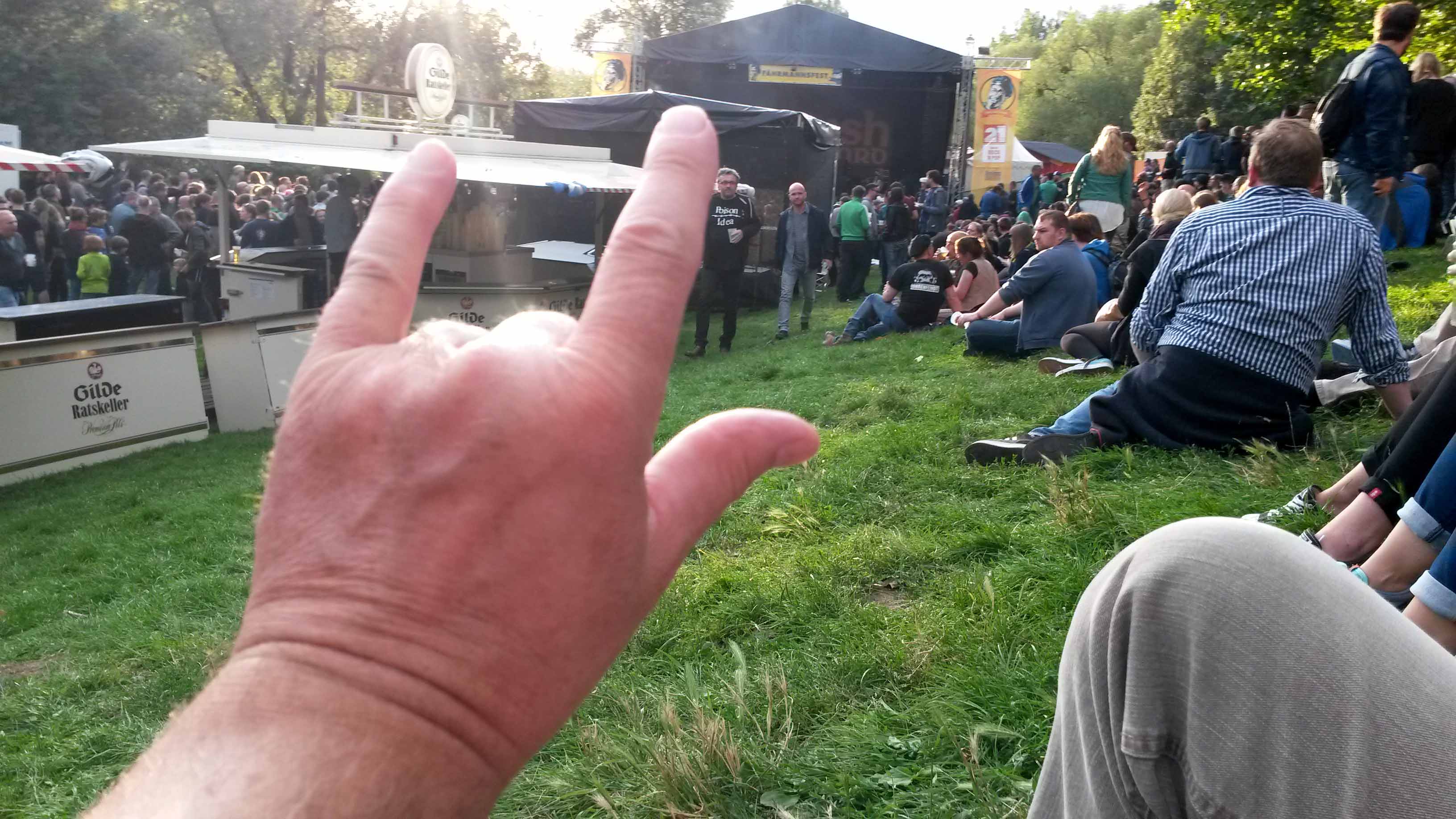 Umstände verschlugen mich unlängst auf ein Rockfestival, das Fährmannsfest, welches den Vorteil hat, dass ich von meiner Homebase nur ein paar Meter bergab (Lindener Berg, 89 Meter N. N.) rollen muss, um aufs Gelände zu gelangen. Den Auftakt bildete eine schreckliche Krachcombo mit irischen Sauf- und Gröltakten, die Nachweis brachten dass sich seit den Zeiten der Pogues offensichtlich nichts geändert hat auf Festivals. Ich war trotzdem „gut“ drauf, die Luft war milde, das Bier kühl und meine Gedanken fluteten frei auf dem Festival herum und siehe – ich hatte eine Erleuchtung! Nicht erst seit Wacken ist die „Pommesgabel“ als Gruß der Metalfans bekannt