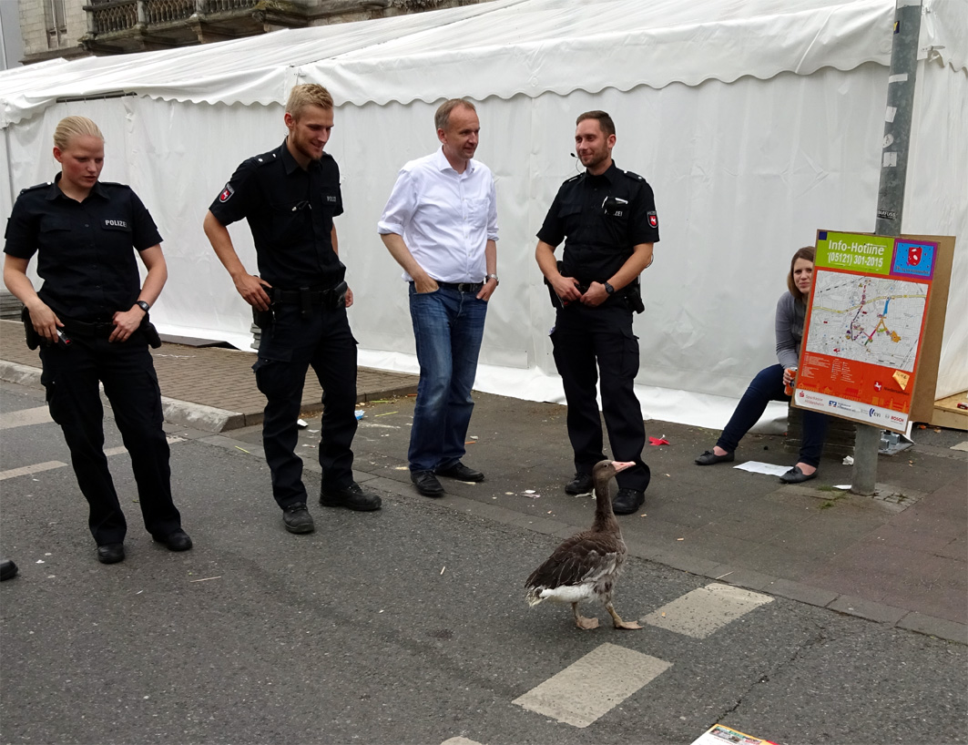 Eigentlich gans nett. Ordnungshüter diskutieren mit einem Mitglied der Anserinae über korrektes Verhalten in der Öffentlichkeit beim Tag der Niedersachsen 2015 in Hildesheim.