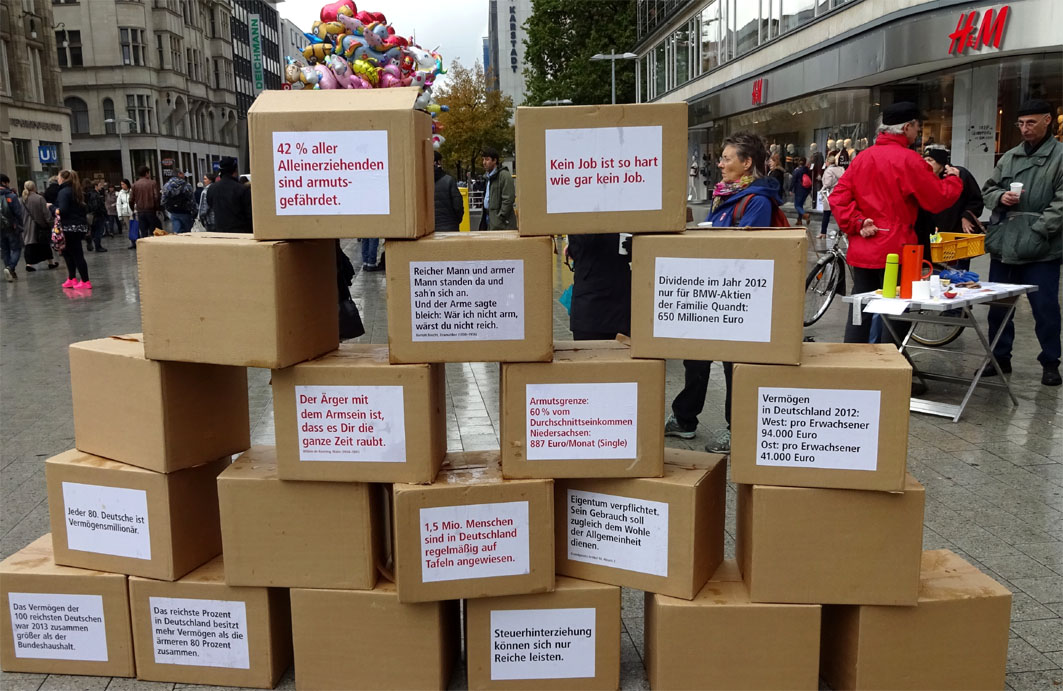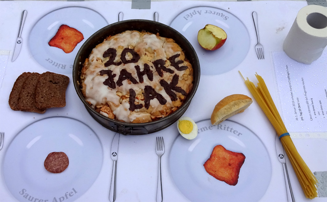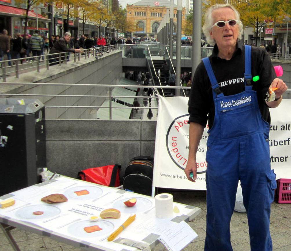 Solche Aktionen sind für mich das Salz in der Suppe. Mit Flyern, Broschüren, Fachtagen etc. sprich: reiner kognitiver Aufklärung, überzeugt man doch höchstens die eh schon Gläubigen. Aufklärung funktioniert nur, wenn sie an gesellschaftliche Bilderzählungen und öffentliche Kommunikation andockt, z. B. bei performativen Kunstinterventionen wie unsere am Weltarmutstag. Außerdem hat es allen Beteiligten ziemlichen Spaß gemacht, wie man hier sieht. Für alle halbgebildeten Künstler und Viertelintellektuellen, die diese Kunst als Sozialgedöns abqualifizieren, als Bildungsgutschein folgendes: Hinter dem Interventionsansatz steht die Theorie von Sergej Tretjakov des operierenden Schriftstellers (Künstlers grundsätzlich), der sich mit seiner ästhetischen Arbeit in die gesellschaftlichen Produktions- und Lebenszusammenhänge begibt und nicht wie ein Geier über ihnen schwebend sie nur registriert oder ausbeutet. Der Ansatz wurde später von Brecht mit der Radiotheorie und Enzensberger, als er noch alle Erbsen in der Schüssel hatte, mit seinem Medienbaukasten fortgeführt. Natürlich gibt es in unseren Kunstproduktionen auch was für Feinschmecker,