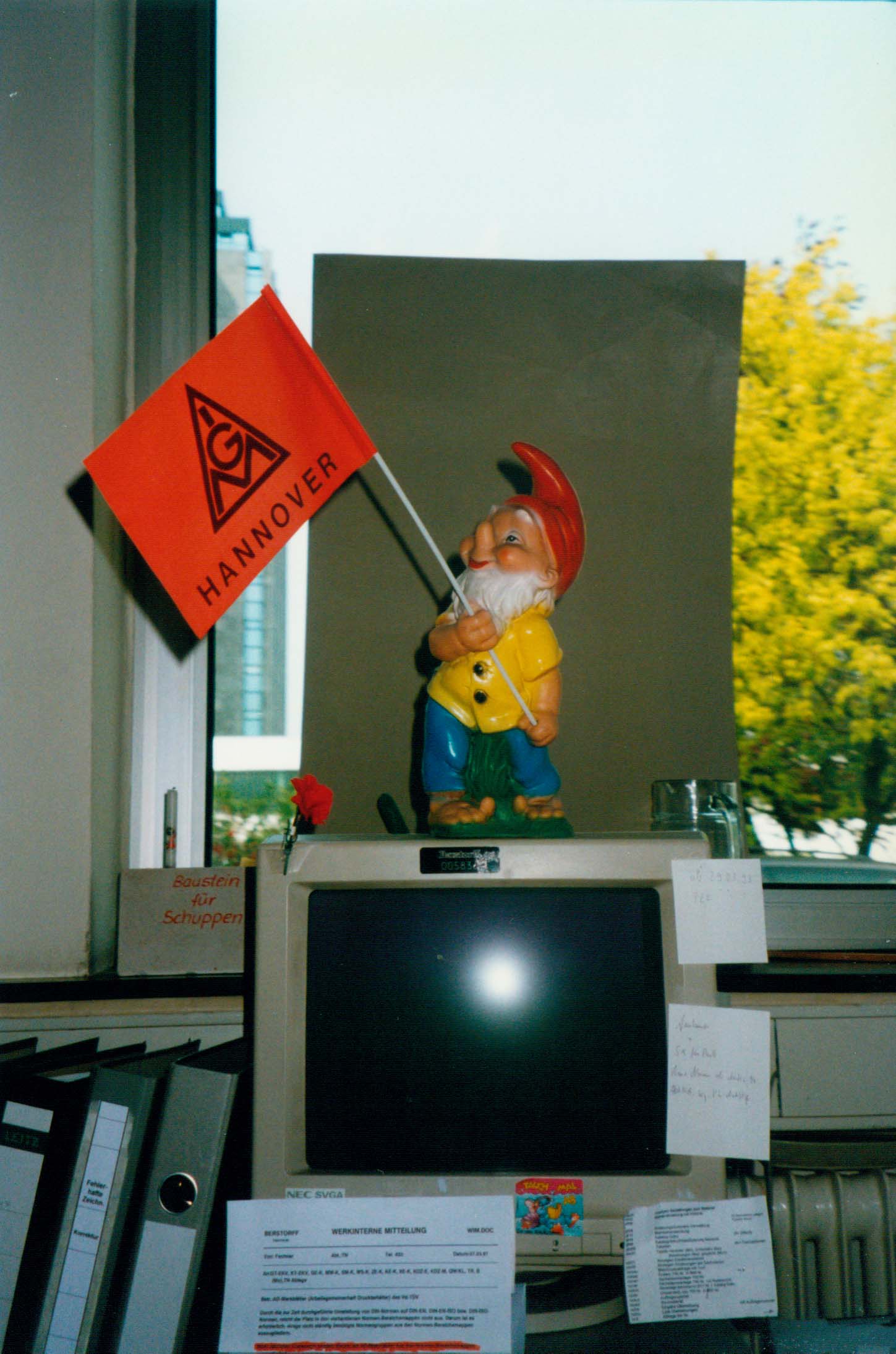Mein Arbeitsplatz bei einer Maschinenbauanstalt, Ende des vorigen Jahrtausends. Was sehen wir? Einen vermutlich 13-Zoll PC-Monitor, bei dem die Röhren größer sind als der gesamte Bildschirm. Eine werkinterne Mitteilung – auf Papier (es geht um Merkblätter der Arbeitsgemeinschaft Druckbehälter des TÜV Nord). Einen Jahrzehnte alten Heizkörper. Papier-Ordner. Einen Gartenzwerg mit einer Gewerkschaftsfahne. Eine rote Nelke vom 1. Mai. Einen SCHUPPEN 68 Baustein. Was sagt uns das Abgebildete? Hm. Also mir vorrangig, dass es kein Wunder ist, dass ich es da nicht bis zum Abteilungsleiter gebracht habe.