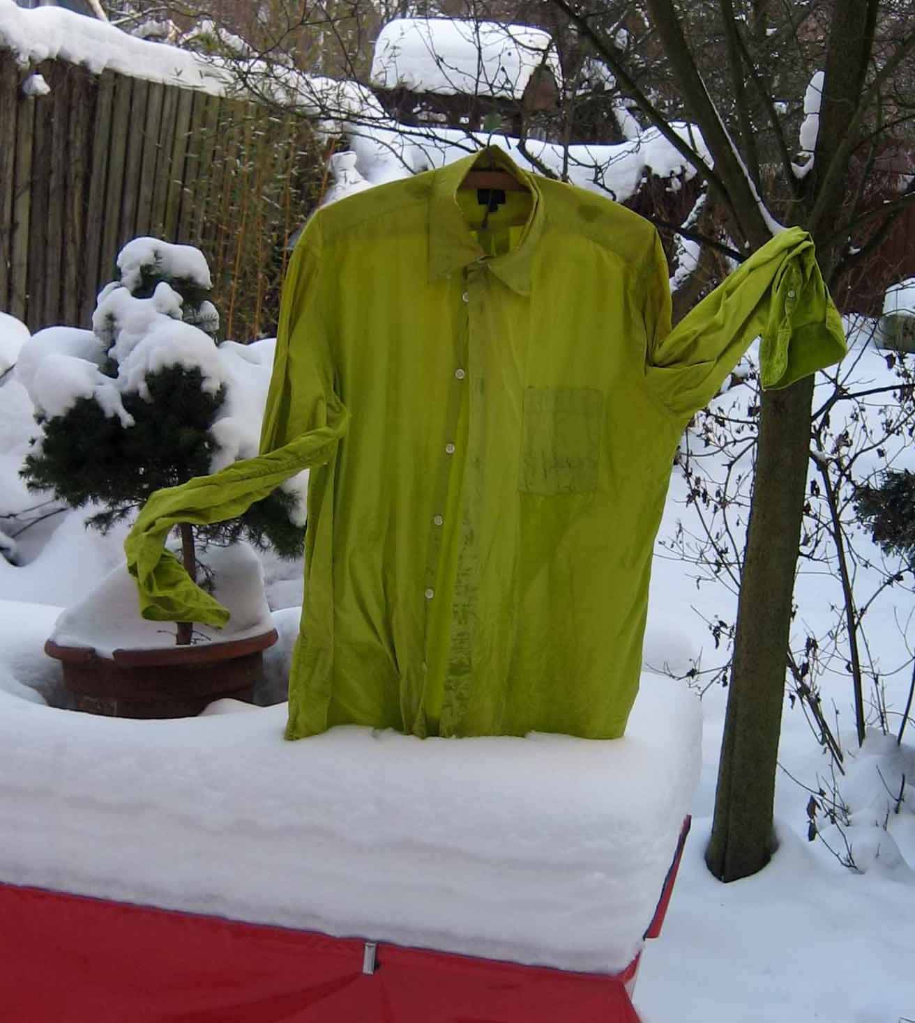 Hier hab ich mal alle meine Hemden draußen einfrieren lassen, als ungefähr Null Grad Kelvin herrschten. Das Hemd steht von selbst im steifgefrorenen Schnee, der Bügel ist festgefroren und hängt in der Luft.