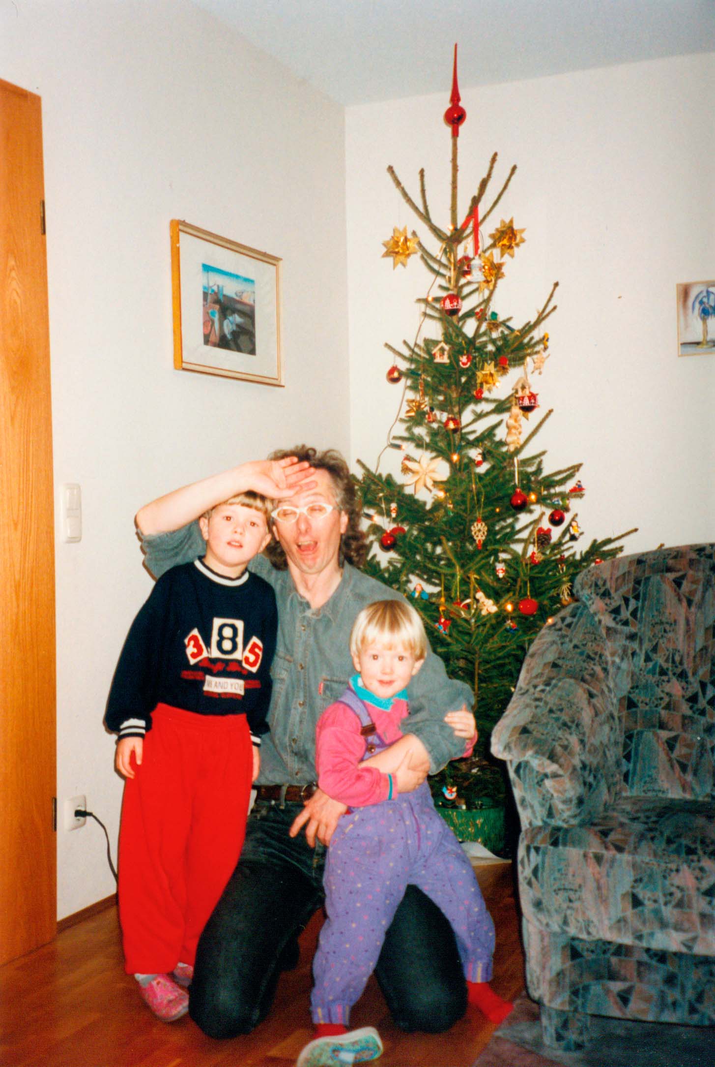 1990er – ich mit Brut von mir nahestehenden Personen. Aus Datenschutzgründen belassen wir es dabei. Ich war gerade zwei Stunden da und schon völlig am Ende. Früher war mir der Reproduktionswunsch von Menschen ein Rätsel. Nach solchen Erfahrungen wie jenem Weihnachten hielt ich den Vermehrungstrieb für eine deviante, pathologische Verhaltensweise, erklärbar nur durch Masochismus, gepaart mit Langeweile. In einer normalen Ehe ist wohl abzusehen, wann man/frau sich nichts mehr zu sagen hat, also überbrückt man die 20 Jahre nach diesem Zeitpunkt mit der Aufzucht von Nachwuchs und wenn der aus dem Haus ist, freut man sich auf die Enkel. Oder den Friedhof.