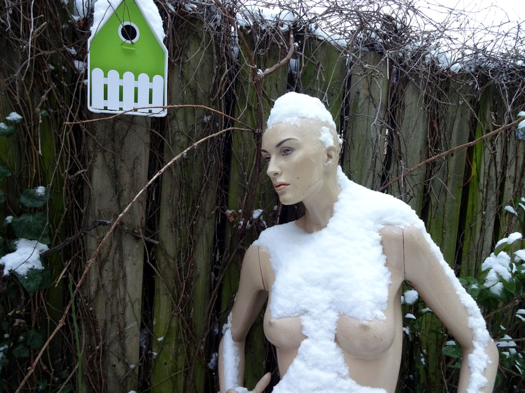 Also musste ich meine Nackte im Garten winterfest machen. Die letzte Lackierung hatte ich ihr per Pinsel verpasst. Komisches Gefühl, weibliche Rundungen, und seien sie noch so unfleischlich wie bei dieser Puppe, mit einem Pinsel nachzuzeichnen. Dieses Jahr ging ich die Sache distanzierter an, mit Sprühlack.