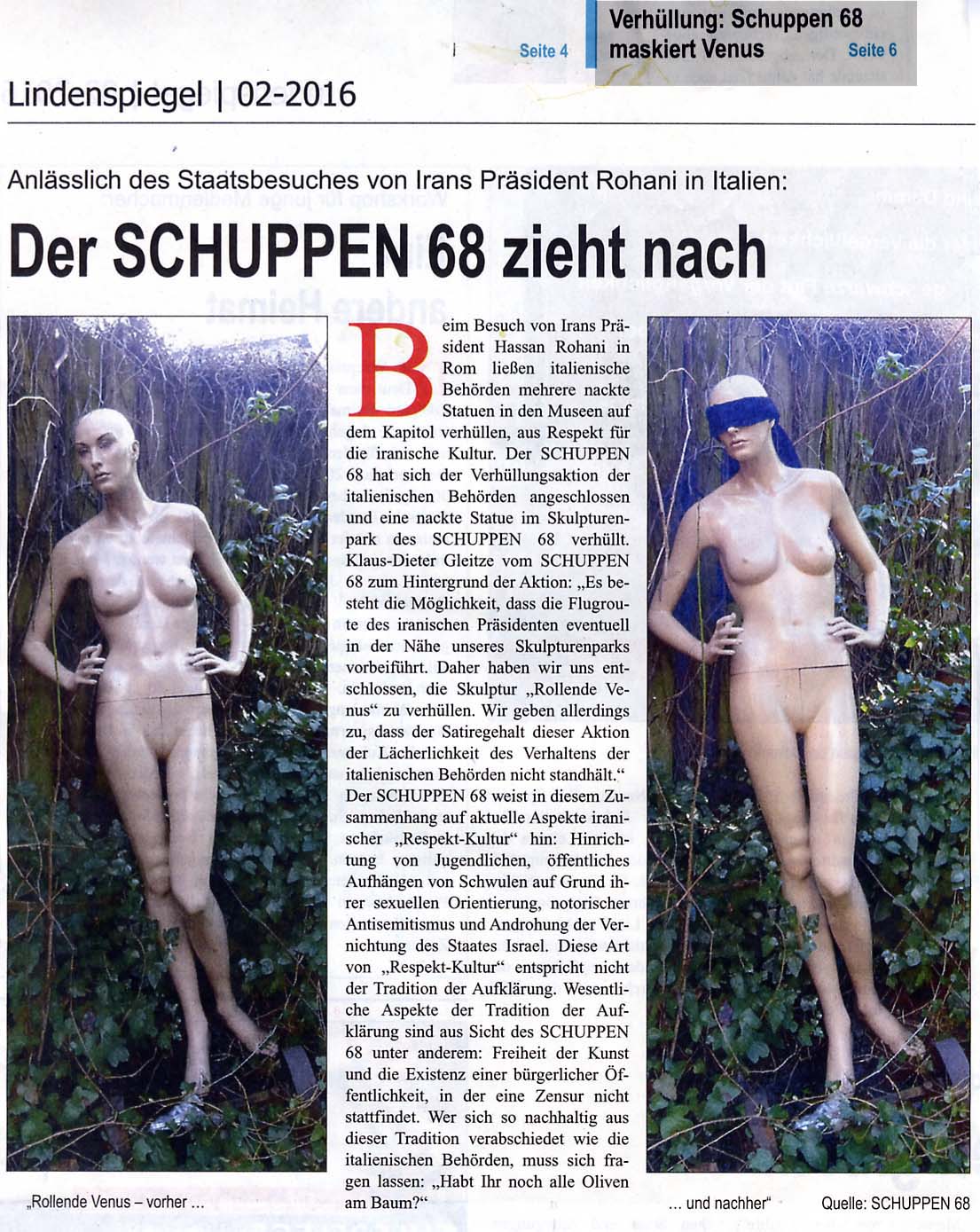 Der Lindenspiegel berichtete ausführlich und korrekt. Besten Dank dafür. Bis auf eine winzigkleine Nuancenverschiebung. Auf der Titelseite wurde der Beitrag angekündigt mit: SCHUPPEN 68 maskiert Venus. In Verbindung mit den verbundenen Augen unserer Skulptur kann man da durchaus assoziieren: Karneval & die SM Hymne „Venus in Furs“ von Velvet Underground. Was eine wirklich gelungene Montage mit dem Narhalla Marsch abgibt.