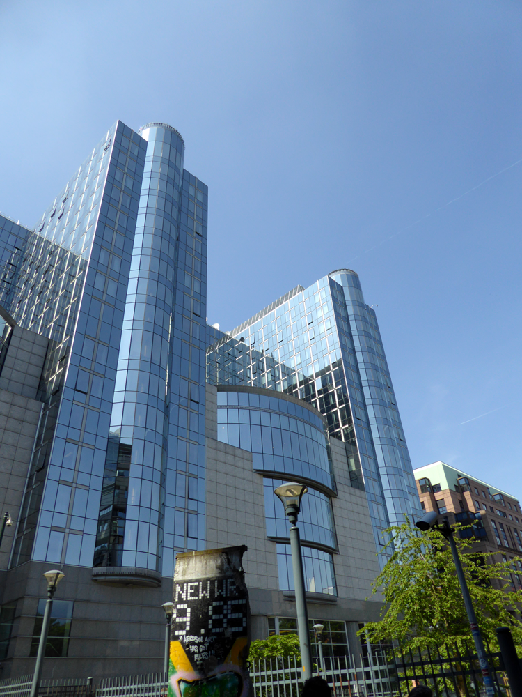 Parlament in Brüssel, natürlich mit Mauerteilstück. Alle real existierenden Mauerteilstücke dieser Welt aneinandergereiht, ergibt eine Strecke zum Mond und wieder zurück.