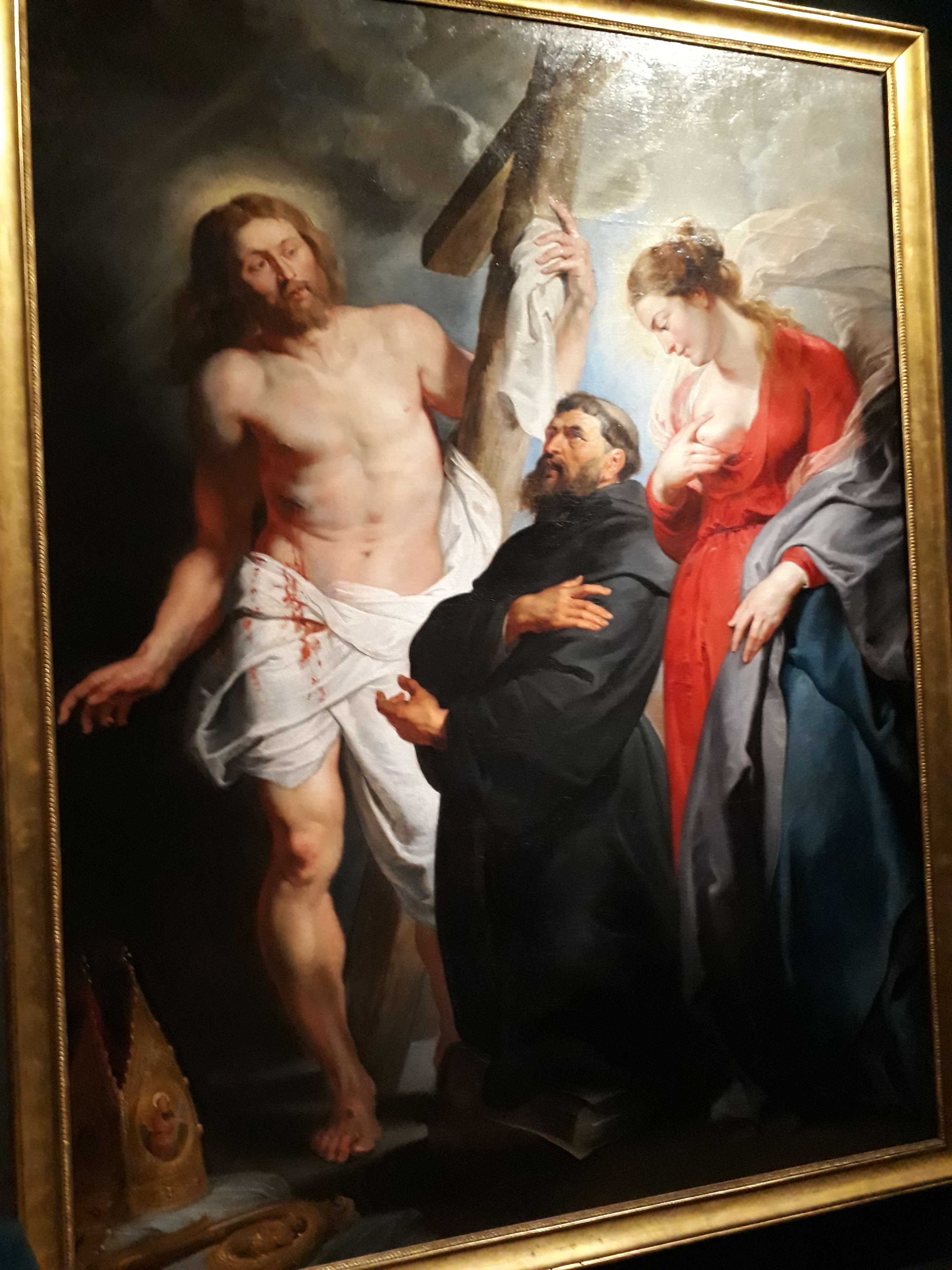 Rubens. Aus der Ausstellung im Frankfurter Städel. Titel hab‘ ich vergessen und zum Googeln keine Lust. Womit wir mitten im Bildthema sind. Der Kuttenträger in der Mitte ist offensichtlich hin- und hergerissen zwischen Weib und Jesus, zwischen Sünde und Glauben, zwischen Lust und Kreuz. Nichts gegen Sado-Maso Praktiken, aber sollte sich der Kuttenträger für den Mann mit dem Kreuz entscheiden, dürfte er schwer einen an der Waffel (hohoho) haben. Immerhin fließt da offensichtlich heftig Blut und die Tatsache, dass sich jemand an ein Holzkreuz nageln (hohoho) lassen will, ohne Aussicht auf Abhängung, also ob das noch im Rahmen klassischer Bondage Techniken ist, scheint fraglich. Es steht auf Grund männlicher Durchschnittsveranlagung eher zu befürchten, dass der Mann mit der Tonsur sich für das Weib entscheidet. Und das geht – unabhängig vom Vergnügen einzelner Beteiligter -für die Sache der Frauen nicht gut aus. Für die Verfehlung, die Sünde des Mannes wird nach schlechter Väter Sitte nicht dieser verantwortlich gemacht, sondern das Weib, als Verführung, sowohl als Individuum als auch Prinzip. Schuld sind immer die Weiber.