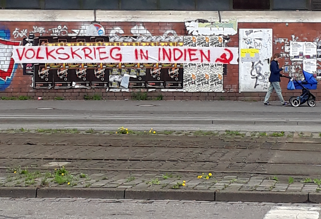 Unsere schwerstbehämmert- und besichelten Genossen von der Fraktion der Gehirnamputierten hantieren in diesem Bild frisch, fromm, fröhlich, frei mit dem Begriff des Volkskriegs in Indien, den sie offensichtlich herbeidelirieren. Hätten sie geschrieben „Klassenkrieg“ hätte ich gesagt: „Ihr habt einen an der Waffel, seid aber zumindest begrifflich nicht völlig in der Hölle der Beschränktheit gelandet.“
