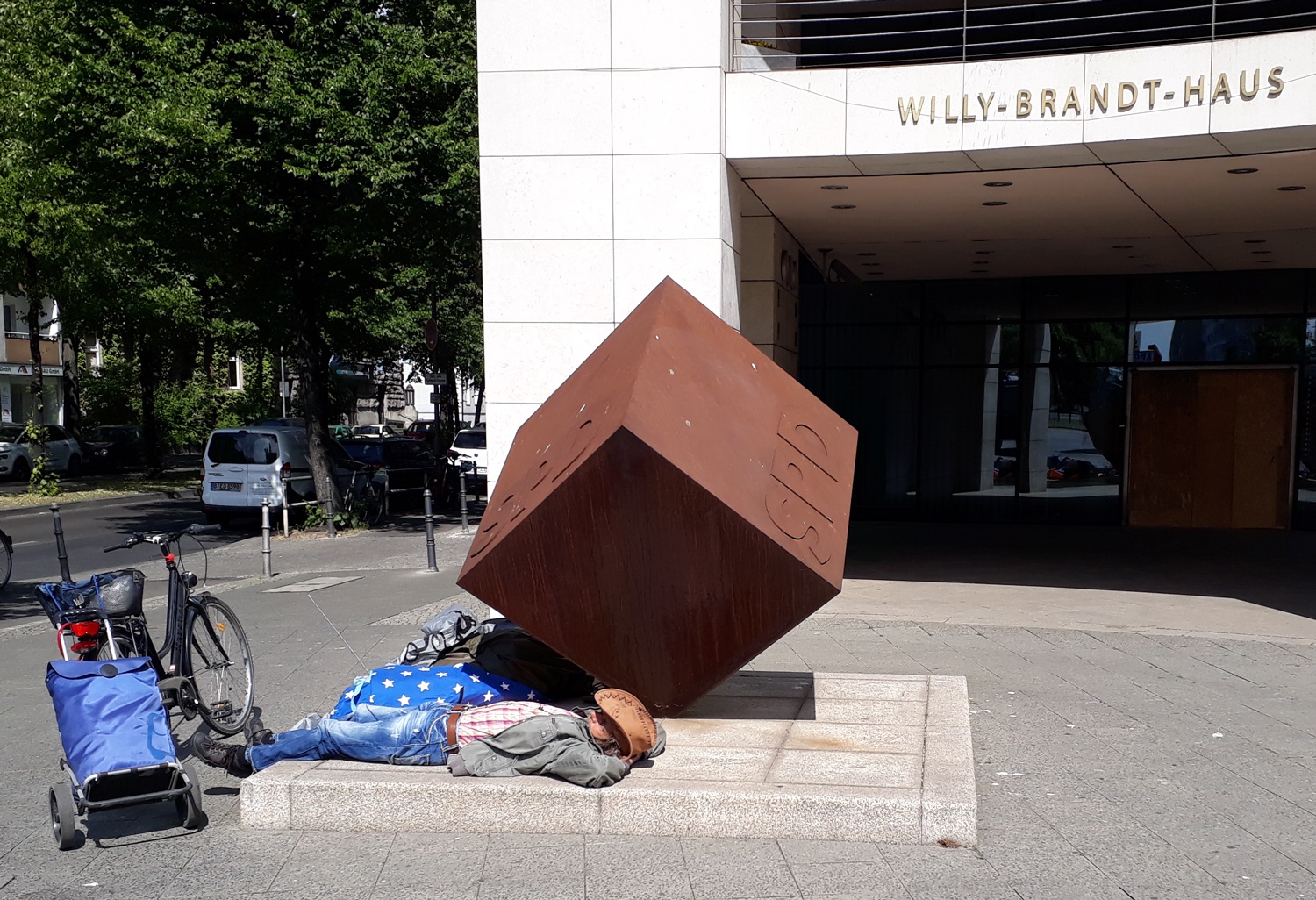Wohnungslose warten vor der SPD Parteizentrale auf die Räumung der Baracke. „Baracke“ war der Spitzname der früheren SPD Parteizentrale, dem alten Erich-Ollenhauer-Haus). Heute ist Baracke die Zustandsbeschreibung für die SPD, deren Agenda 2010 mitverantwortlich ist für wachsende Armut und Wohnungslosigkeit. Insofern wäre der Bezug der SPD-Parteizentrale durch Wohnungslose nach dem Abriss der SPD ein symbolischer Akt von Gerechtigkeit, wäre die Causa SPD nicht ein derartiges Trauerspiel. Bei aller Genugtuung darüber, recht behalten zu haben, dass die Agenda 2010 ein katastrophaler strategischer Fehler für die SPD war – abgesehen davon, dass die Agenda eine moralische Niedertracht sondergleichen war – darf eines nicht vergessen werden: was ist die Alternative zur SPD? Die Alternative für Deutschland. Und das lässt mir jedes Triumphgeheul über die „gerechte“ Strafe der Geschichte für die SPD im Halse stecken. Was wir erleben, ist die Komposition einer gesellschaftlichen Totenmesse für eine Partei, in Echtzeit.