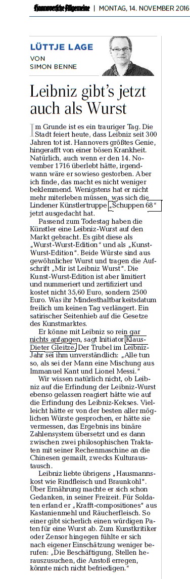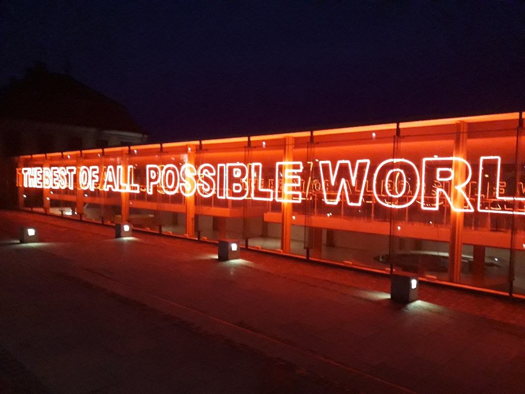 „Wir leben in der besten aller möglichen Welten“, das Motto der obigen Lichtinstallation stammt vom hannöverschen Leib- und Magenphilosophen Leibniz, eine mangels regionaler Alternativen vom hiesigen Bürgertum maßlos überschätzte Wurst, zu der ich auch schon meinen Senf gegeben habe