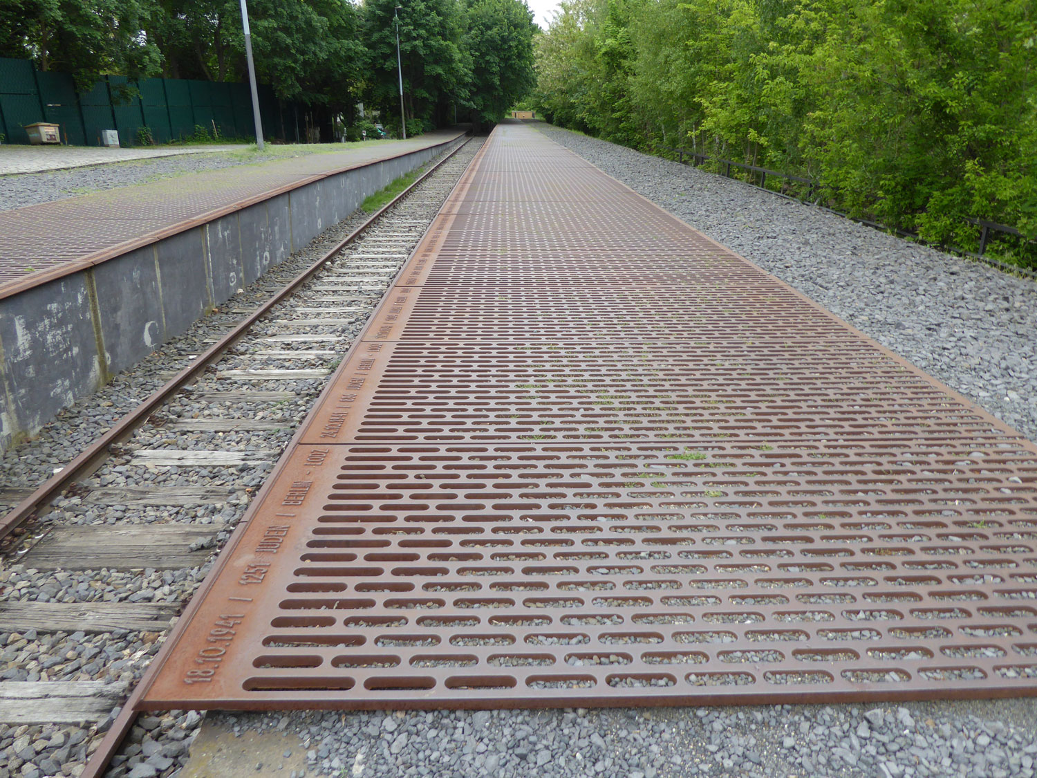 Auf Stahlplatten stehen in endloser Reihe Datum und Anzahl der Juden, die von dort aus in die Vernichtungslager deportiert wurden.