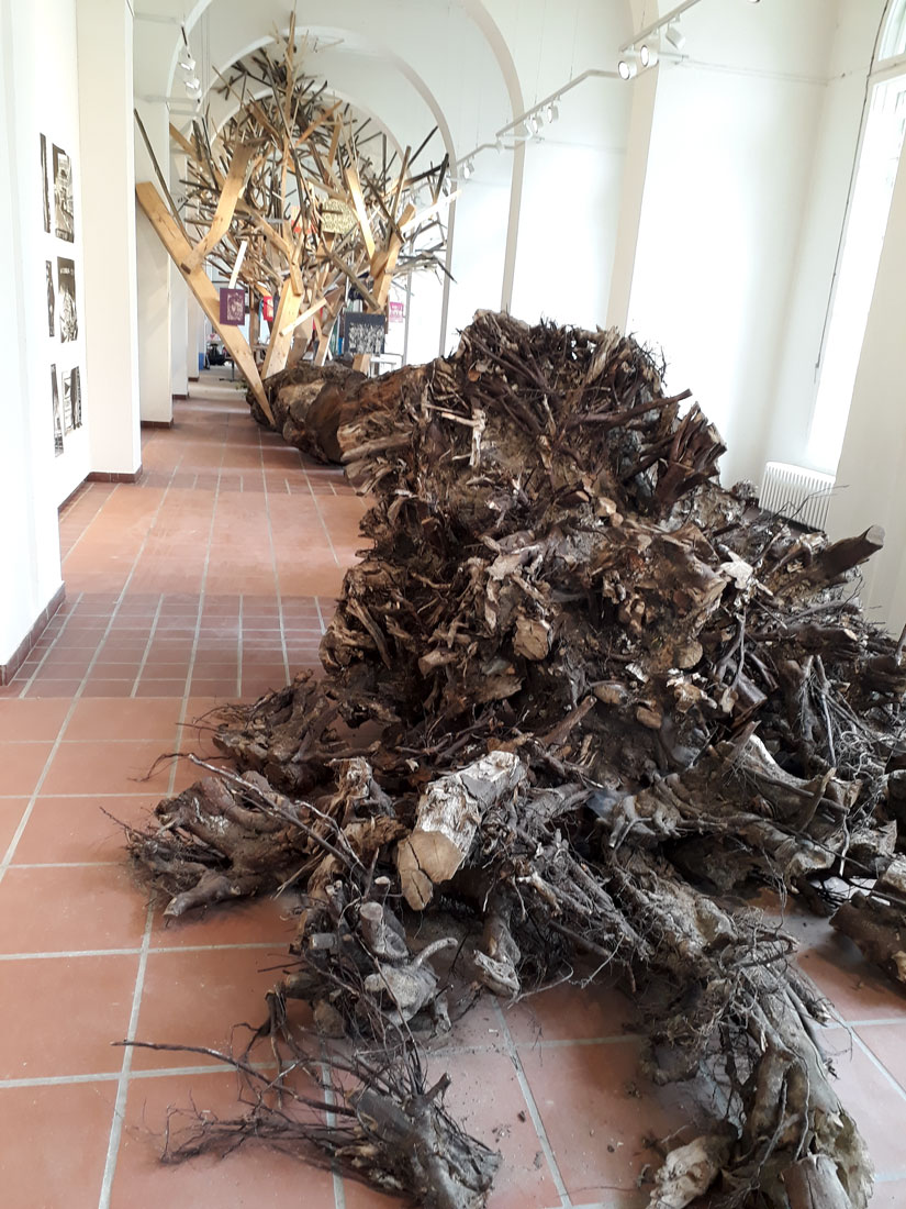 Der gleiche Baum als Kunstwerk in einer Ausstellung über Flucht und Migration in der Galerie Körnerpark, Juni 2018.