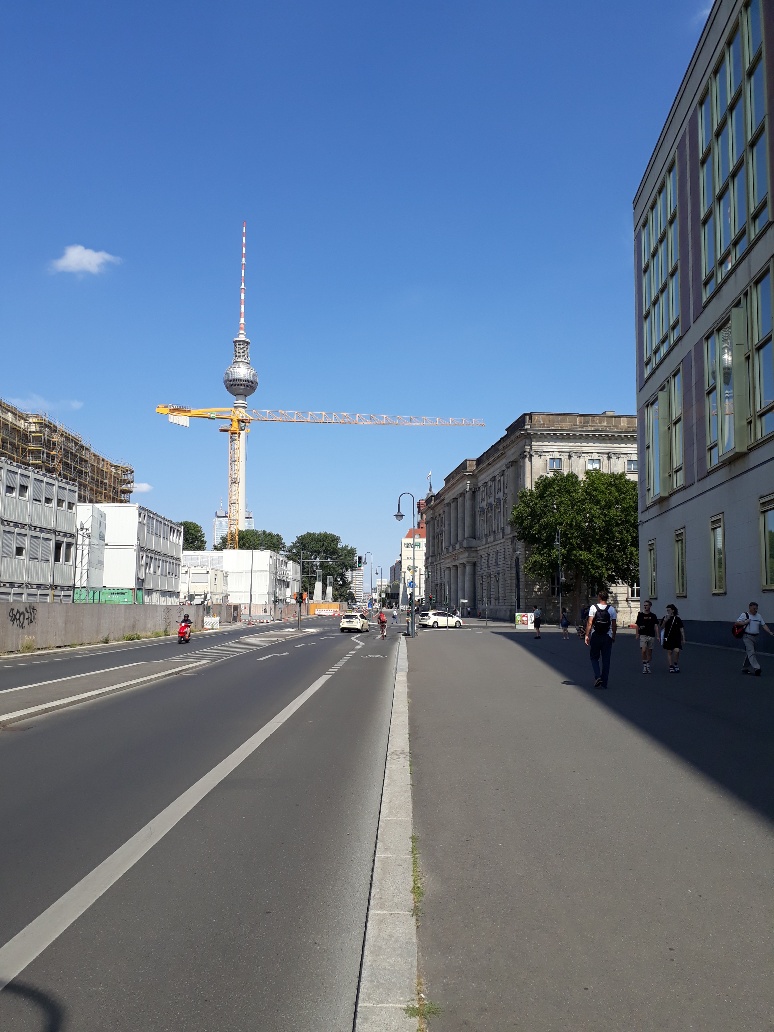 Kann man Hitze sehen? Berlin Mitte, Sonntag, Menschenleer. Touris flüchten in Museen, Eingeborene an Badeseen,ich als Intermediärer pendele zwischen Beiden, dankbar für U-Bahn Schächte. U-Bahn mit Rad klappt besser als gedacht. Berlin ist eine arme Kommune, U-Bahn Schächte als kostenpflichtige Kühlstationen wären doch eine zukünftige Einnahme-Quelle, wenn es noch heisser wird. Und da ist noch reichlich heisse Luft nach oben, die Hitze-Europarekorde liegen in Kreta und Portugal bei 48 Grad. Wir mit unseren lächerlichen 36 Grad für heute sollen da mal mit dem Fächer nicht so wild wedeln.