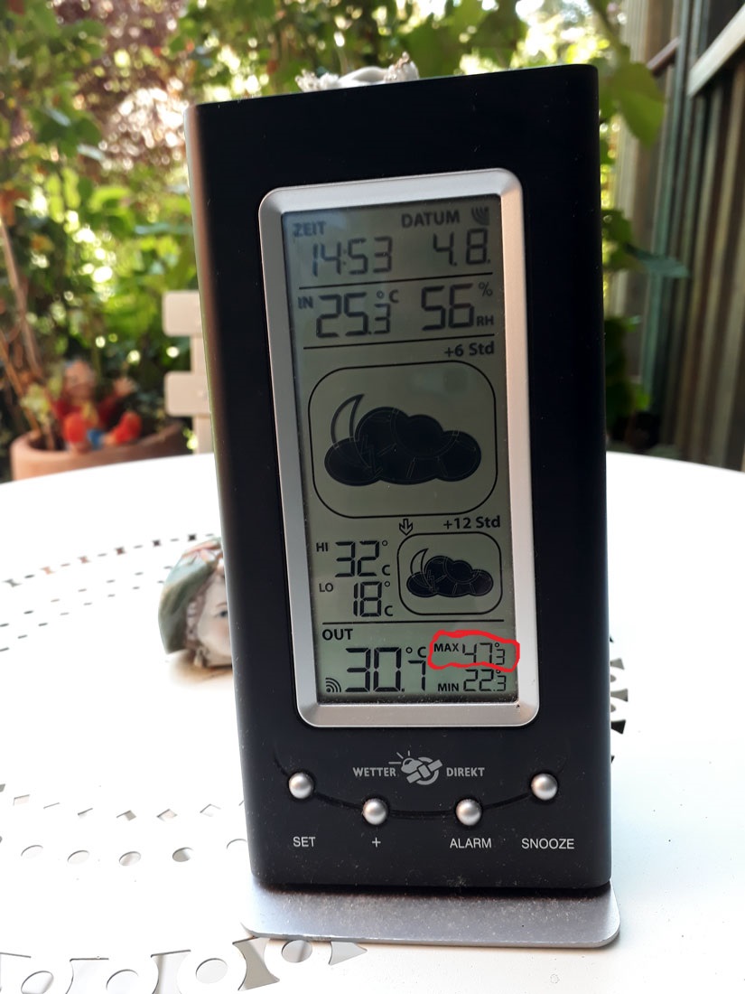 04.08.2018, Außentemperatur auf meiner Veranda 47,3 Grad Celsius, in der Sonne gegen 13 Uhr. Um 14.53 Uhr war die Sonne da schon verschwunden und es herrschten angenehme 30 Grad. Innen 25 Grad. Wärmer wird es drinnen bei mir nie. Ich gehöre damit zu den Krisengewinnlern, wenn es zur Klimakatastrophe kommt und wir Temperaturen wie im Death Valley haben. Dann vermiete ich meine Bude stundenweise an Klima-Binnenflüchtlinge, arme Schweine, in deren Wohnungen unterm Dach das Wasser im Kochtopf von alleine anfängt zu sieden.