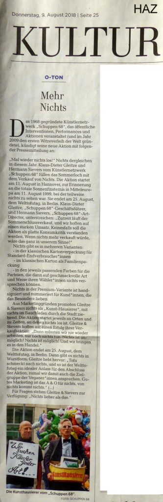 Die HAZ berichtet heute, unsere PM im O-Ton zitierend. Schön, weil man sich irgendwie verstanden fühlt. Hier als Bonusmaterial für treue Leserinnen die komplette PM SCHUPPEN 68 füllt Sommerloch mit Nichts_V1….
