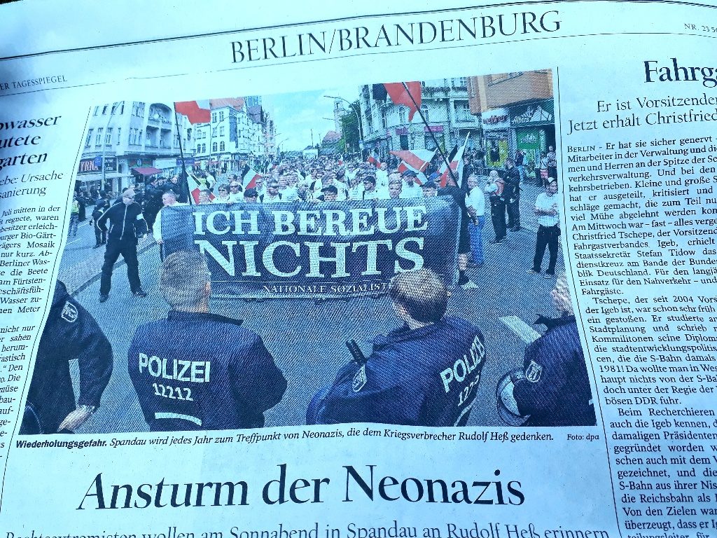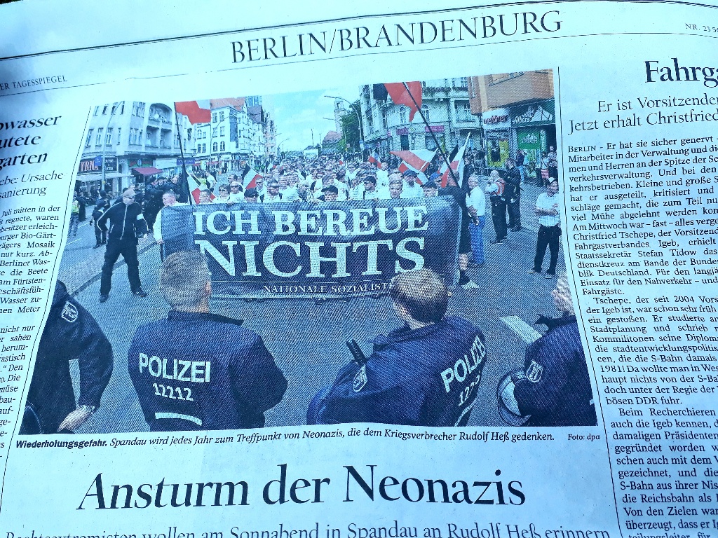 Das nutzen Nazis zu jährlichen Demonstrationen, unter anderem mit Hess‘ Parole (siehe Bild oben aus dem „Tagesspiegel“). Dagegen formiert sich regelmässig antifaschistischer Widerstand, was ebenso regelmässig von der minderintelligenten Fraktion der Bürgerpresse mit der Parole denunziert wird „Rechte und linke Chaoten“, die damit der Totalitarismus-Theorie des Kalten Krieges folgt „Sozialismus gleich Nationalsozialismus“.