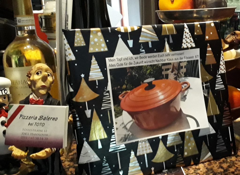 Toto macht zu. Who the fuck is Toto? Toto ist mein Puschen-Italiener. Er ist exakt zwei Häuser von meiner Homebase entfernt und immer, wenn ich keine Lust habe zu kochen oder Essen zu gehen und mir danach zumute ist, klemme ich mir meinen Topf unter den Arm und hole mir bei Toto eine Portion Spaghetti Bolognese. Niemals etwas anderes. Immer mit Puschen. Niemals mit Straßenschuhen. Immer mit dem gleichen Topf. Niemals ein anderer. Ich bin ein Mann mit Grundsätzen. Der Topf ist ein uralter Le Creuset, siehe oben. Sündhaft teuer, ein Geschenk, ich würde mir sowas niemals leisten, und ich würde sowas auch niemals außer Diensten stellen. Ich bin ein Mann von Grundsätzen. Ich bleibe Ideen, Personen und Gegenständen, die es wert, sind ein Leben lang treu. Auch Töpfen. Selbst Salzstreuern. Der Topf ist unglaublich unpraktisch. Er wiegt mehrere Doppelzentner und ist ohne eine Seilwinde kaum zu bewegen. Als ich die ersten Male damit bei Toto auflief, kamen die Köche aus der Küche gerannt, um zu gucken, was das für ein Topfbesitzer sei, unter lautem Mamma mia. Ist ja schließlich ein Italiener. Jetzt nach fast 40 Jahren macht Toto zu.