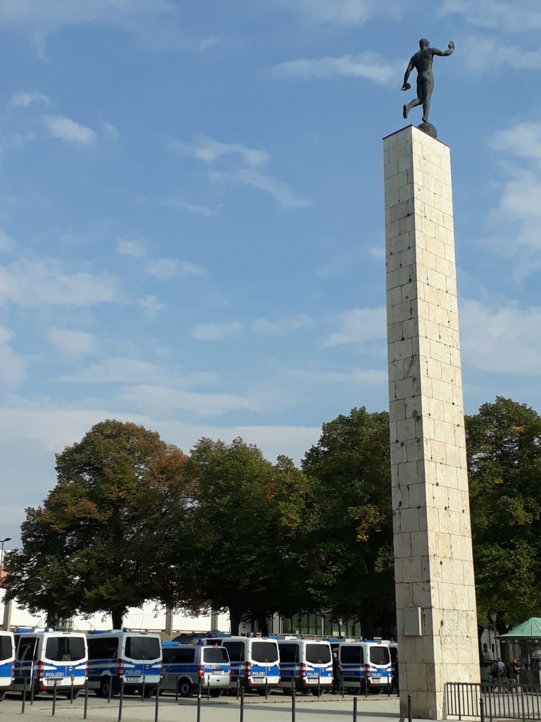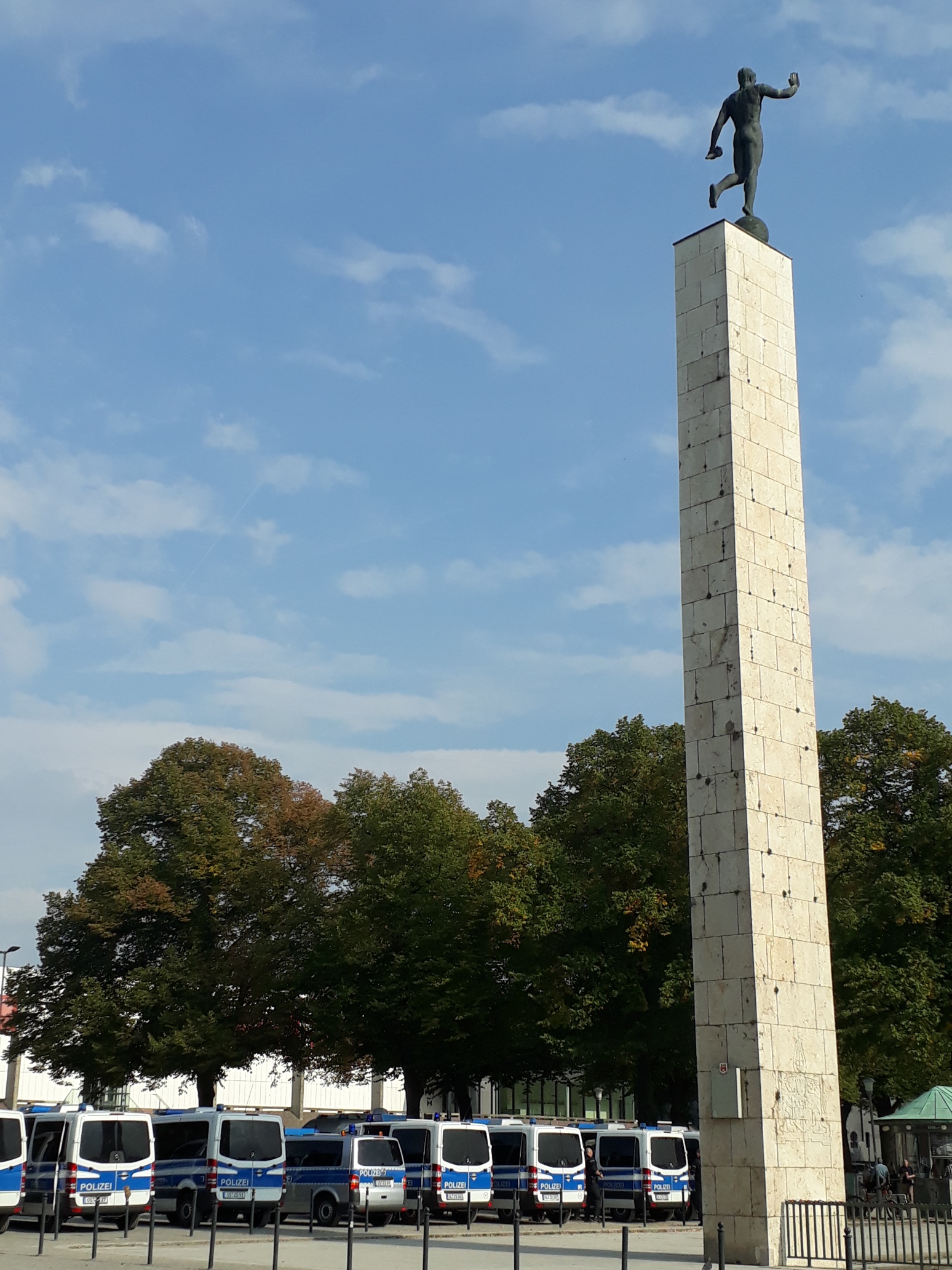 Fahrzeuge für Angehörige des Repressionsapparates vor dem Fackelträger. (Nein, wir sagen nicht mehr „Bullenwannen“). Der Fackelträger ist eine Ikone faschistischer Skulptur Kunst und wurde mittels Info-Tafeln entnazifiziert.