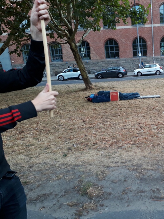 Obdachloser, der sein Quartier auf dem „Grün“streifen einer viel befahrenen Hauptstraße bezogen hat. Vermutlich, weil er da vor Gewalt gegen Obdachlose besser geschützt ist.