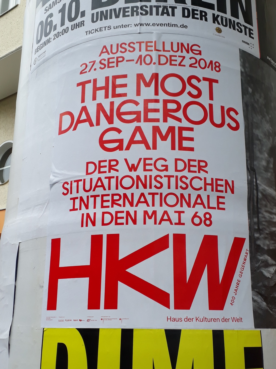 The most dangerous Game. Ausstellung über die Situationistische Internationale SI. Dieses Plakat hat mich regelrecht elektrisiert. Mich haben drei Strömungen in der Kunst fasziniert, intellektuell begeistert und auch in meiner Kulturproduktion beeinflusst: vor allen anderen die frühe sowjetische Avantgarde, in Teilen Dada und die SI. Die SI verband radikal Kunst und Politik, Leben und Kultur, bestand nur aus ein paar Leuten in den Sechzigern und ihre grösste Leistung ist aus meiner Sicht ihr Einfluss auf Kunstrichtungen , ohne die die Kunstmärkte seit den Sechzigern nicht denkbar sind: Fluxus, Happening, Performances, Soziale Plastik etc. pp. Ohne SI kein Punk, keine Sponti-Bewegung (Unter dem Pflaster ist der Strand, das war ein Motto der SI). Die SI war die letzte Avantgarde, danach kam nur noch Pop und Postmoderne, also zu weiten Teilen affirmativer Mist. Und SI war Politik, ohne SI kein 68.
