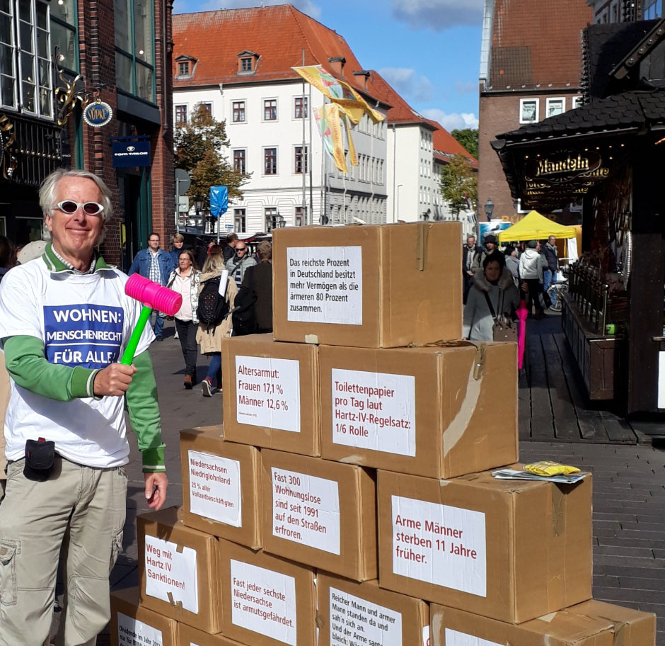 Ich, mit der Macht des Argumentes, getrieben vom Furor der Aufklärung, vor der Mauer zwischen Arm und Reich. In Lüneburg, Aktion am 29.09.2018 zum Thema: „Wohnen (besser: Wohnung) ist ein Menschenrecht.“
