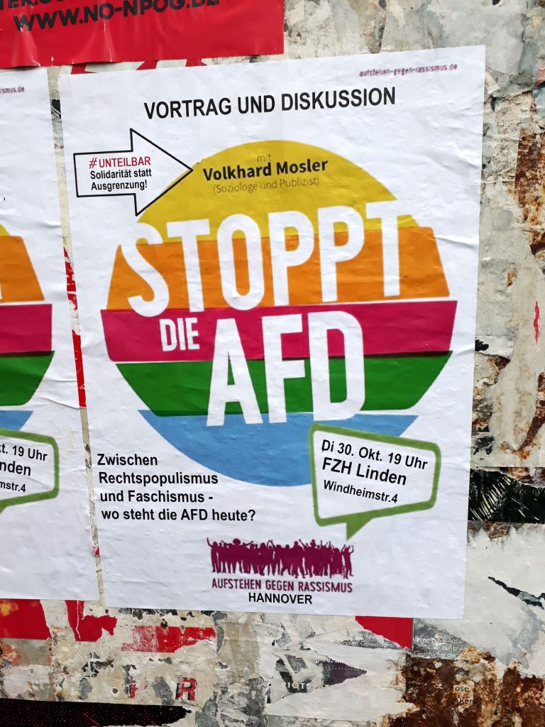 Aber vorher für alle Spontaneitätsfähige und Kurzentschlossene dieser Terminhinweis für Heute Abend im FZH Linden um 19 Uhr. Eine nicht unwesentliche Frage für Strategien der Gegenwehr, ob eine Partei noch „nur“ rechtspopulistisch ist oder schon faschistisch. Außerdem wird die Veranstaltung von einem Kumpel organisiert, der Unterstützung verdient. Feiner Kerl. Wir sehen uns nachher, liebe Leserinnen, ich geb‘ einen aus.