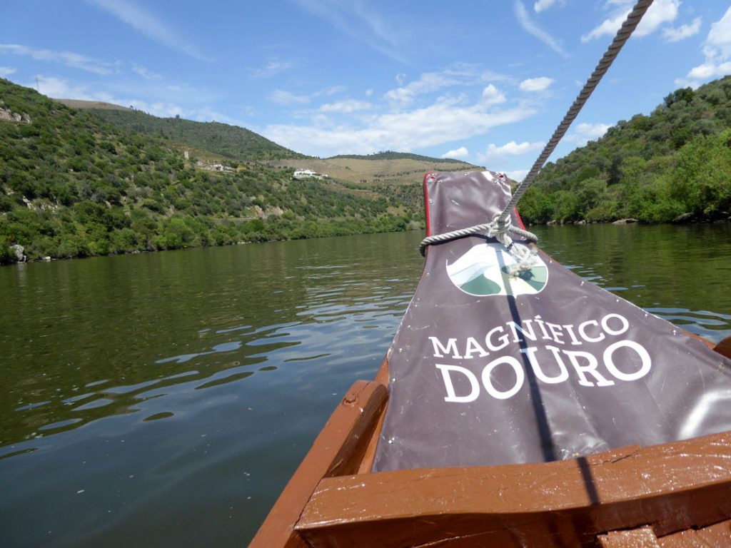 Quinta de la Rosa (die hellen Gebäude am linken Flussufer) am Douro, wo das köstlichste Getränk auf Erden produziert wird: Der Portwein.