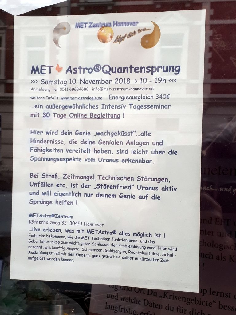 Jenseits von Wissenschaft, Erkenntnis und Evidenz bewegen wir uns im dunklen Bereich des Glaubens. Ich kann diesen hirnrissigen Schwachsinn glauben, ich kann auch glauben, dass mein Eisenmangel bekämpft wird, wenn ich mir einen Nagel in den Kopf hämmere oder dass ich meine Geldsorgen durch Auflegen einer verfaulten Kartoffel bekämpfe. Wenn solcherlei Glauben bedauernswerten Seelen, vom Leben überforderten Existenzen und sonstigen armen Würsten kurzfristig Frieden verschafft – why not? Wer bin ich, darüber den Stab zu brechen? Das Leben ist so rasend, die Veränderungen so massiv, dass immer mehr Menschen zu Alkohol, Drogen, Esoterik greifen, um überhaupt überleben zu können. Da ist Met Astro Quantenquark sicher ein gesünderes und geringeres Übel, außer dass es den Tatbestand des Betrugs erfüllt und im Zweifel Existenzen, die eh bankrott sind, den Beutel noch mehr leert.