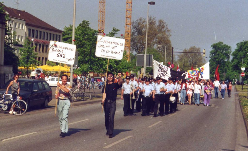 Vollkommen berechtigte Forderungen des gewerkschaftlichen Flügels des SCHUPPEN 68 beim 1. Mai-Marsch 1993.