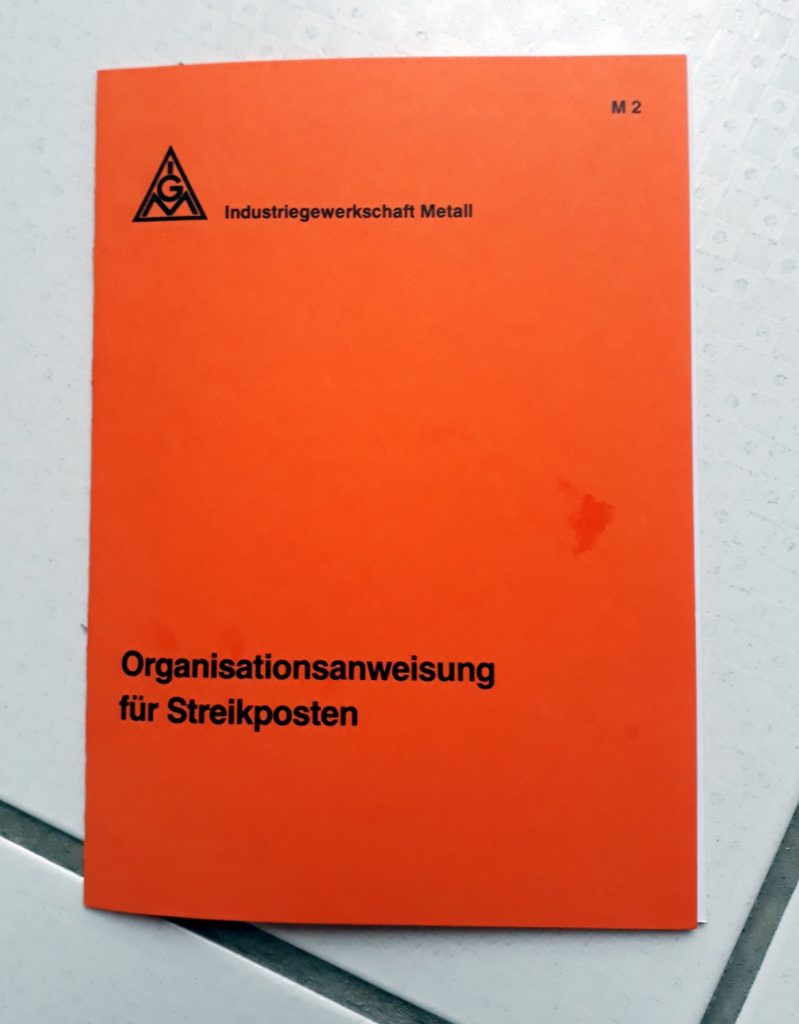 Für jeden neuen Ordner, den ich anlegen muss, fliegt ein alter raus. Papier ist sowas von 20. Jahrhundert, ich brauch’s auf der Toilette, aber nicht beim Arbeiten, und so kommt ein Ordnerwechsel sehr selten vor. Wenn doch, stehe ich immer vor der schweren Wahl: Wer fliegt raus? Dieses Mal hat es den Ordner „Gewerkschaften etc.“ erwischt. Die sind zwar auch sowas von 20. Jahrhundert, werden aber im Gegensatz zu Papier auf dem Schreibtisch auch im 21. Jahrhundert gebraucht. Und deshalb flöhte ich den Altordner gründlich auf wichtiges Archivmaterial. Wie meine Streikpostenbibel, siehe oben. Das Büchlein hat mich daran erinnert, dass ich auch mal Streikposten war. Ich habe lange Jahre als Angestellter im Maschinenbau gearbeitet, war als solcher natürlich auch Mitglied der IG Metall, hab Betriebsrats- und Vertrauensleutearbeit gemacht, später auch gewerkschaftliche Bildungsarbeit und so war es selbstverständlich für mich, dass ich aktiv an der Auseinandersetzung um die Einführung der 35-Stunden-Woche beteiligt war. Als Streikposten. Der Konflikt war nach dem um die Einführung der Lohnfortzahlung im Krankheitsfall der härteste, den es überhaupt in der Klassenkonfrontation zwischen Arbeit und Kapital in der Nachkriegszeit gab.
