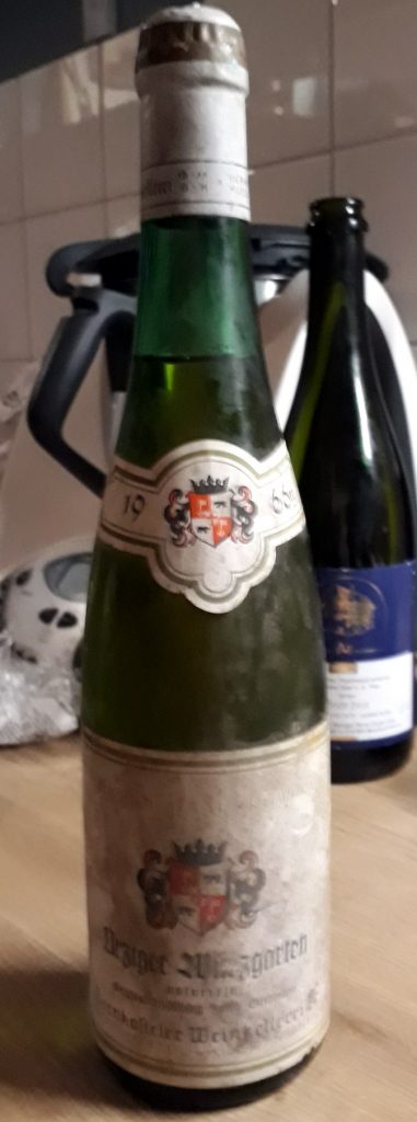 Ürziger Würzgarten Jahrgang 1966. Das ist eine Lage an der Mosel, in der seit 2000 Jahren Wein angebaut wird, gut und teuer. Spitzenweine von der Mosel gehören zu den teuersten der Welt. Obige Flasche brachte ein Freund zur Sylvesterfeier mit, skurrile Umstände hatten sie in seinen Besitz gebracht und was sind Weinfreuden, wenn man sie nicht mit Freunden teilt, am besten solchen, die was von Wein verstehen? Der Korken war völlig hinüber und bröselte beim Korkenzieher Ansetzen sofort in die Flasche, wir mussten den Inhalt durch ein Filter-Sieb dekantieren. Der Wein hatte eine tiefgoldene Farbe und war in der ersten Nase weder zu Sherry noch zu Essig geworden. Er war vollkommen genießbar.