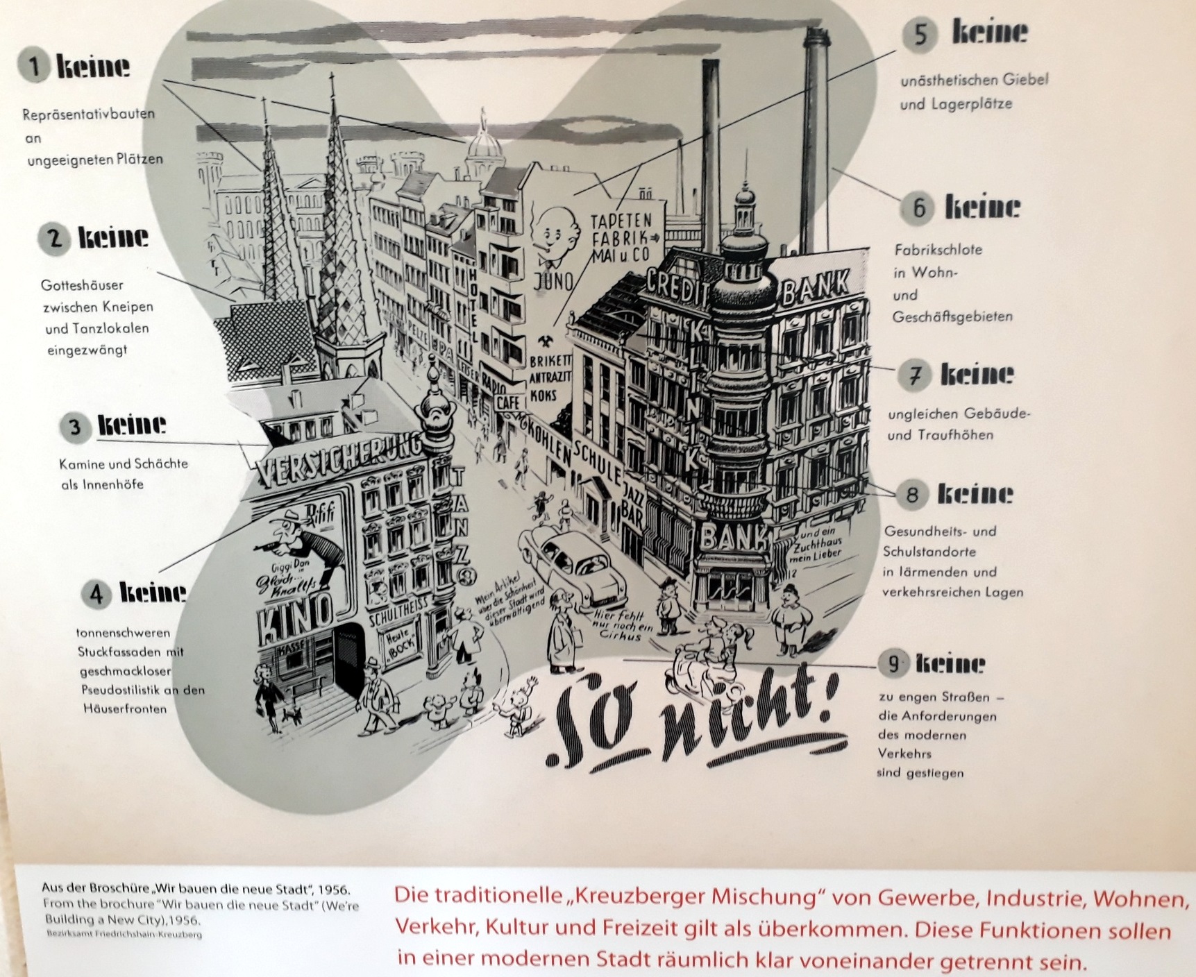 Städtebauplanung in den 50ern. Eine der vielen informativen Schautafeln im Friedrichshain-Kreuzberg Museum. Wer verstehen will, wieso die Wohnungsproblematik in vielen urbanen Regionen und darüber hinaus die große aktuelle soziale Frage schlechthin ist, findet hier tolles Anschauungsmaterial. Städtebau bewegt sich in Zyklen. Der auf der Schautafel Abgebildete wurde in den alternativen 60/70er Jahren abgelöst von einer Utopie der Verbindung von Kieznahem Leben und Arbeiten in einem Zusammenhang, parallel begleitet von heute noch überall sichtbaren Mainstream-Relikten und Ruinen der Großwohnlagen, von Cities in der City, in denen sich Wohnen und Konsum auf einer Großfläche durchmischen sollten. Über allem schwebt unausrottbar Spießers Traum vom eigenen Häuschen im Grünen, Yuppies Drang in die Szenelofts, wachsende Segregation und Gentrifizierung inclusive explodierender Wohnungslosigkeit und am Ende, alles überstrahlend mein Dank an mich selbst, wenigstens einmal in meinem Leben was richtig gemacht zu haben und mir vor Jahrhunderten ne eigene Butze gekauft zu haben. Wo ich nach einem möglichen Atomschlag – die Atomkriegsuhr steht auf 2 vor 12, schlimmer stand sie noch nie https://de.wikipedia.org/wiki/Atomkriegsuhr – sogar Subsistenzwirtschaft betreiben kann, Hühner halten und Kartoffeln anbauen (wobei es in meinem Fall auf Marihuana hinausläuft). Individuell bin ich also guter Dinge, aber als kollektiv denkender und fühlender Homo Politicus bin ich angesichts der Verhältnisse auf einer Dauerpalme und laufe angesichts wachsender gesellschaftlicher Verrohung und Idiotie sowie staatlicher Unfähigkeit, ideologischer Fixierung und pathologischer Verdrängung von Realitäten mit einer permanenten Hasskappe rum. Man kann ja angesichts des Zustandes von Staat und Gesellschaft nur froh sein, dass bei uns das Kapital regiert. Natürlich nicht so, wie sich das Verschwörungstheoretische linke und rechte Kasperköpfe vorstellen, dass in Davos und auf der Bilderbergkonferenz ein paar Leute (Freimaurer und Juden) bestimmen, wo es lang geht und hinterher Angela Merkel am Telefon diesbezügl. einnorden.