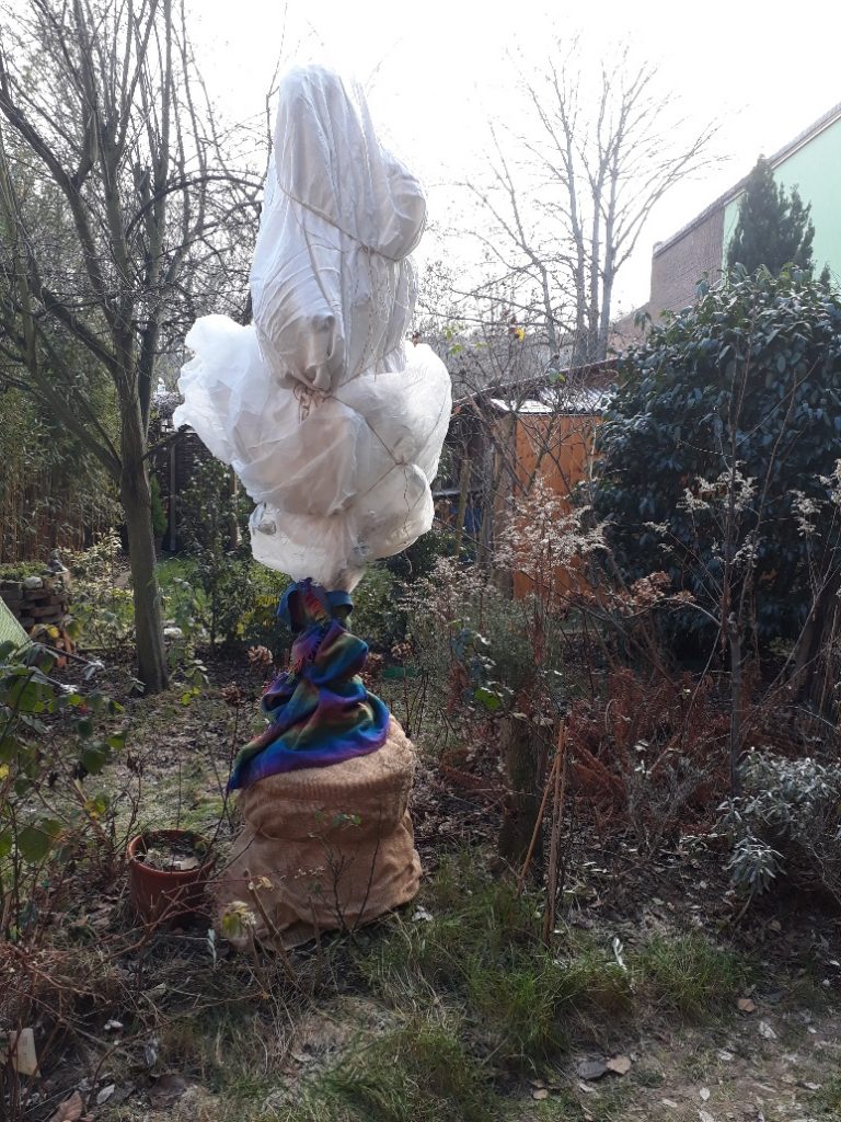Olivenbaum, eingehüllt leider nicht von Christo, sondern von mir. Im Christo Fall wäre er eine Million Euro wert und eine Pilgerstätte für alle Kunstliebhaberinnen, in meinem Fall kümmert das kein Schwein. Ab minus 7 Grad beginnt die Schmerzgrenze für Olivenbäume und da dieses Monstrum zu schwer zum in den Keller schleppen ist, muss es jedes Mal eingehüllt werden, wenn diese Grenze droht. Was sie tut und mich ins Fluchen bringt. Ich hasse Gartenarbeit jeglicher Art. Sie ziemt sich nicht für einen Mann meines Standes.