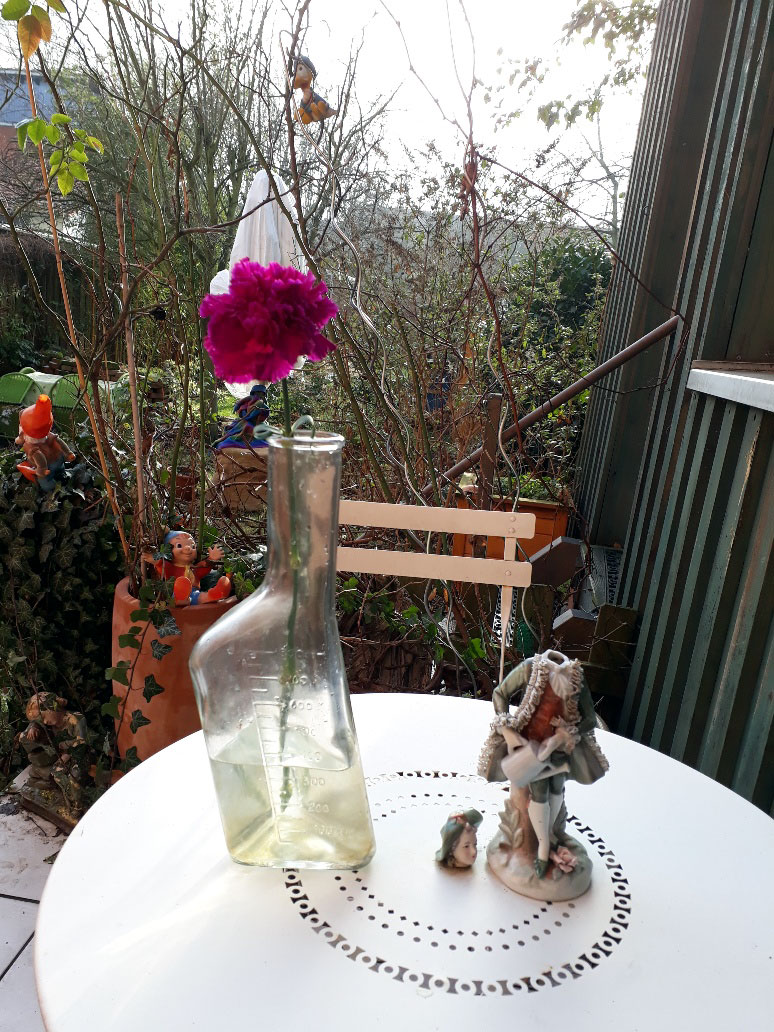 Nelken halten bei dem Wetter draußen ewig. Die Nelke ist die Blume der Arbeiterbewegung, Symbol der portugiesischen Nelkenrevolution, und vollkommen out. Die Ayurvedageneigte Dame von Vegan-Welt stellt sich gerne eine Calla in die Ökoecke. Wobei ich keine Ahnung habe, ob sich das verträgt: Vegan und Schnittblume? Ist Schnittblume nicht Mord an Schwester Blume? Oder sind das eher Fruitarierinnen, die so denken, wenn sie denn denken? Und steckt in Fruit-Arier mehr von der rassistischen Bedeutung des Begriffs „Arier“ drin, als die zufällige Verkofferung des Wortes sagen will? Fruitarier ist nämlich ein Kofferwort. Das sind so Gedanken, die mir gerade beim Schreiben durch den Kopf gehen, die mich aber einen Furz interessieren. Was für eine Vergeudung von Lebenszeit, mit Gedanken belästigt zu werden, die einen nicht interessieren.