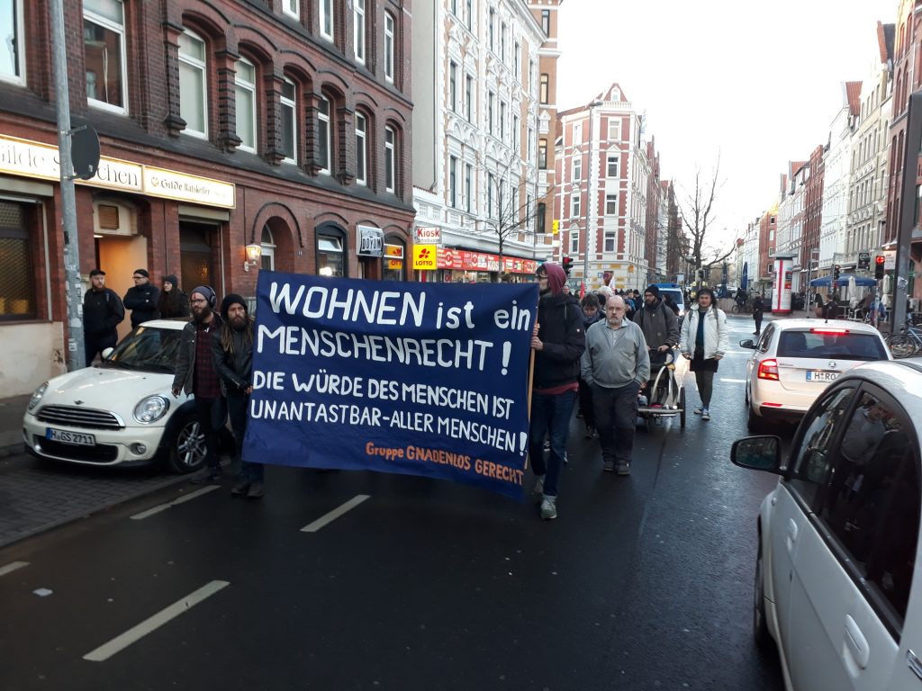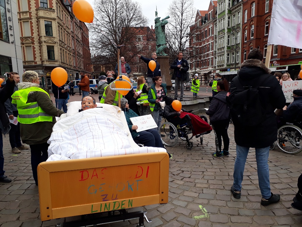 Demo gegen Schließung und Abriss des Godehardistiftes, Altersheim bei mir umme Ecke. Ich habe das Heim im Betrieb kennengelernt, fand das Personal sehr angenehm und zugewandt und wenn es in solchen Strukturen überhaupt ein Sterben in Würde geben kann, dann da. Mein Entschluss stand fest: In ca. 60 – 70 Jahren, wenn ich nicht mehr ganz so flink unterwegs bin, dann dahin. Da sich das Gerücht breit machte, dass das Gebäude keineswegs marode sein soll, sondern der in diesem Kiez obwaltenden Gentrifizierung auf Kosten schnuckeliger Eigentumswohnungen geopfert werden könnte, ergab sich ein idealer Schnittpunkt zweier Motivationslinien: 1. Persönliche Betroffenheit und 2. Politischer Impuls.