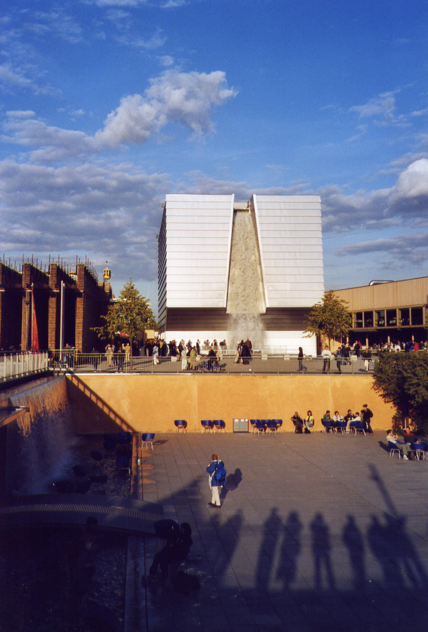 Norwegischer Pavillon mit Wasserfall, EXPO 2000, Hannover. Der Wasserfall zur EXPO 2035 wäre in den immer extremer werdenden, brüllheissen Sommern gerade in der Betonhölle von Kreuzberg ein Überlebensspender, an dem sich die Jugend der Welt zu friedlichem Austausch versammeln würde. Was für eine wundervolle Vision einer besseren Welt.