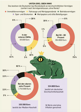Interessant wird es, wenn wir in die Details zoomen. Das Vermögen der unteren Hälfte befindet sich zu 44 Prozent auf dem Girokonto, bei den oberen 10 Prozent nur zu 13 Prozent.