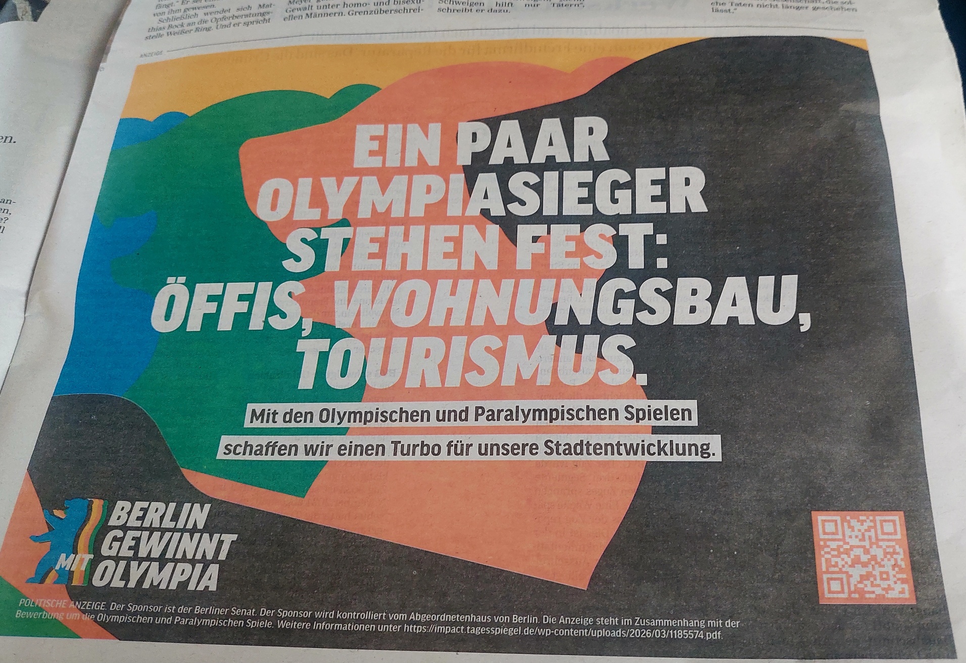 Anzeige aus dem Tagesspiegel. Die Werbekampagne für Olympia 2036 in Berlin nimmt an Fahrt auf. Olympiasieger Wohnungsbau halte ich für ein Gerücht. Gebaut wird teurer Luxus, sozialer Wohnungsbau kannste vergessen. Und noch mehr Touris hier? Das ist doch jetzt schon nicht zum aushalten. Und preistreibend ohne Ende. Eine Olympiasiegerin steht jetzt schon fest, vielleicht darf sie sogar die Spiele 36 eröffnen: Alice Weidel. Wenn alsbald die Inflation als Folge des Irankrieges anzieht, wie schon gehabt, mit „Explosionen“ bei Grundnahrungsmitteln und Energie, muss man kein stabiles Genie sein, um zu ahnen, dass die AfD davon profitiert. Wer mit kaltem Hintern hungernd im Winter 26/27 in seiner Bude hockt, im Rahmen von Industriekrise und Massenarbeitslosigkeit gerade „auf der Straße “ gelandet ist, dürfte für wohlfeiles Talkshowblablabla von bürgerlichen Parteien ungefähr so empfänglich sein wie Kälber für messerschwingende Sirenengesänge der Metzger vor dem Schlachthof. Dann doch lieber gleich das Original zumal die Kanzlerin für Olympia 36 diesesmal nicht so einen uncoolen Schnauzbart trägt.