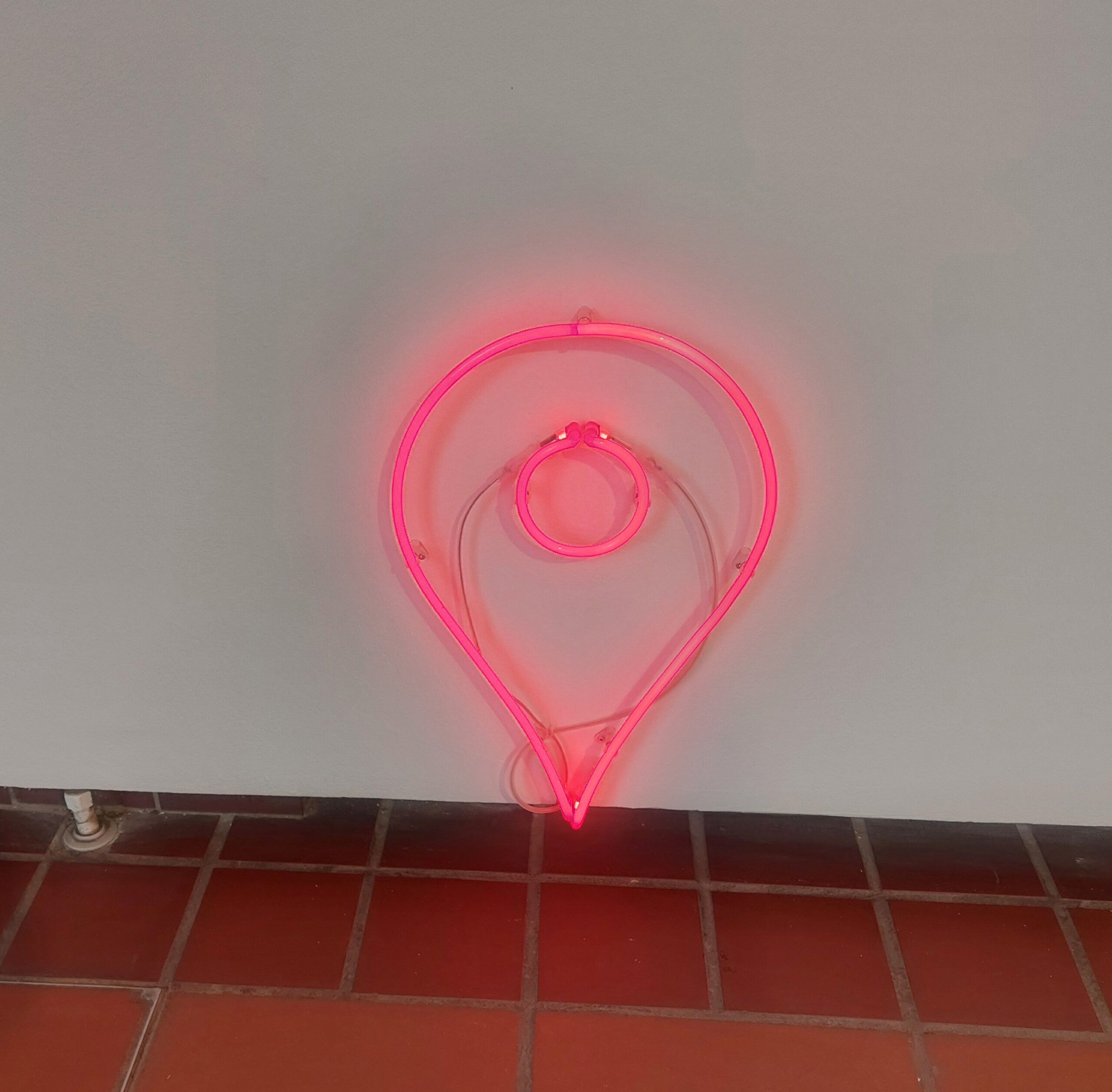 Map Icon, Karin Sander, 2020, Galerie im Körnerpark, Neukölln. Ausstellung „Architecture of hidden activity“. Das Google Maps-Zeichen als Leuchtschrift, das uns global an kulturelle und kommerzielle Tourismus-Orte führt. Digitale Indoktrination. Kunst einfach, aber einleuchtend.