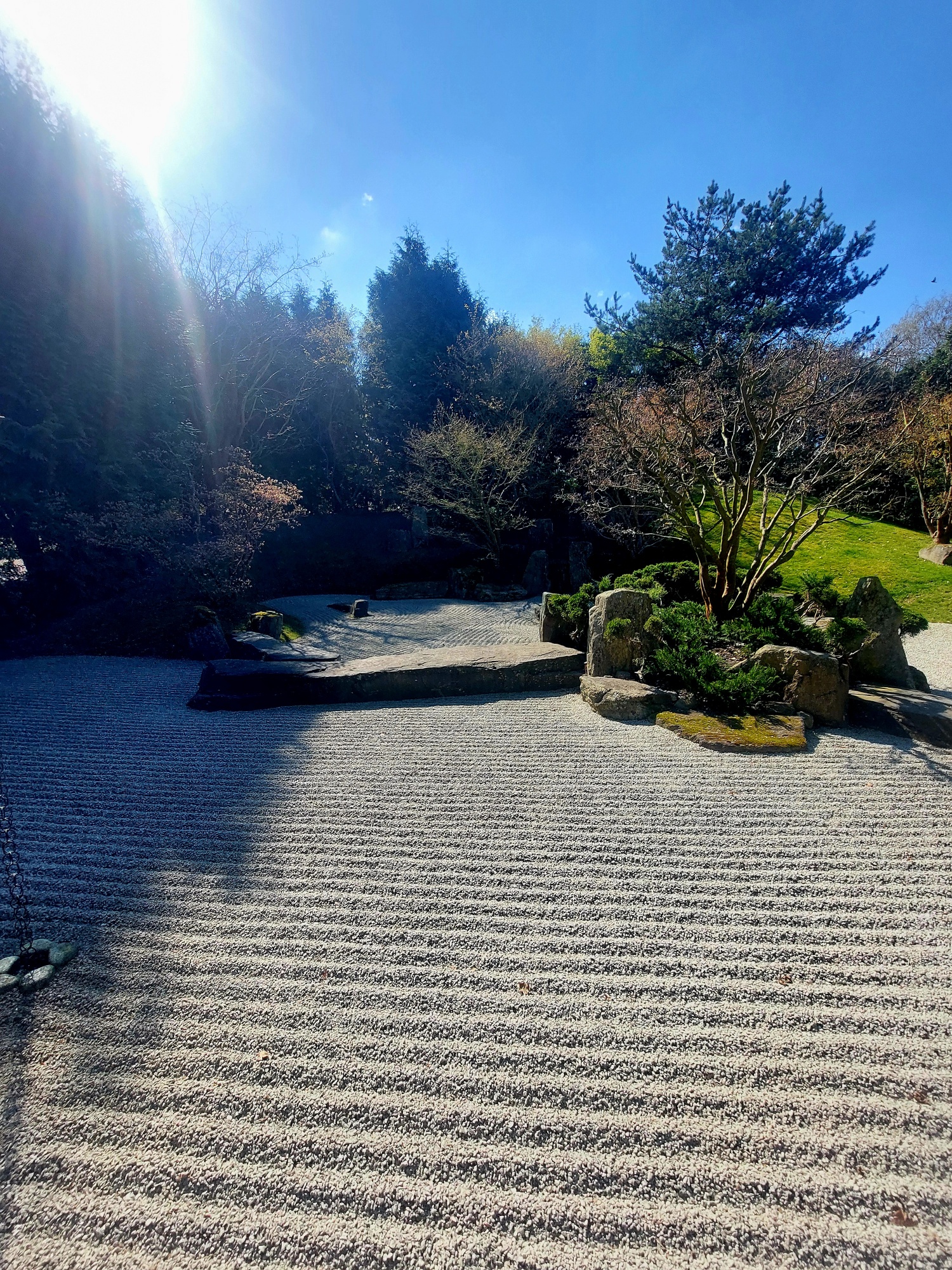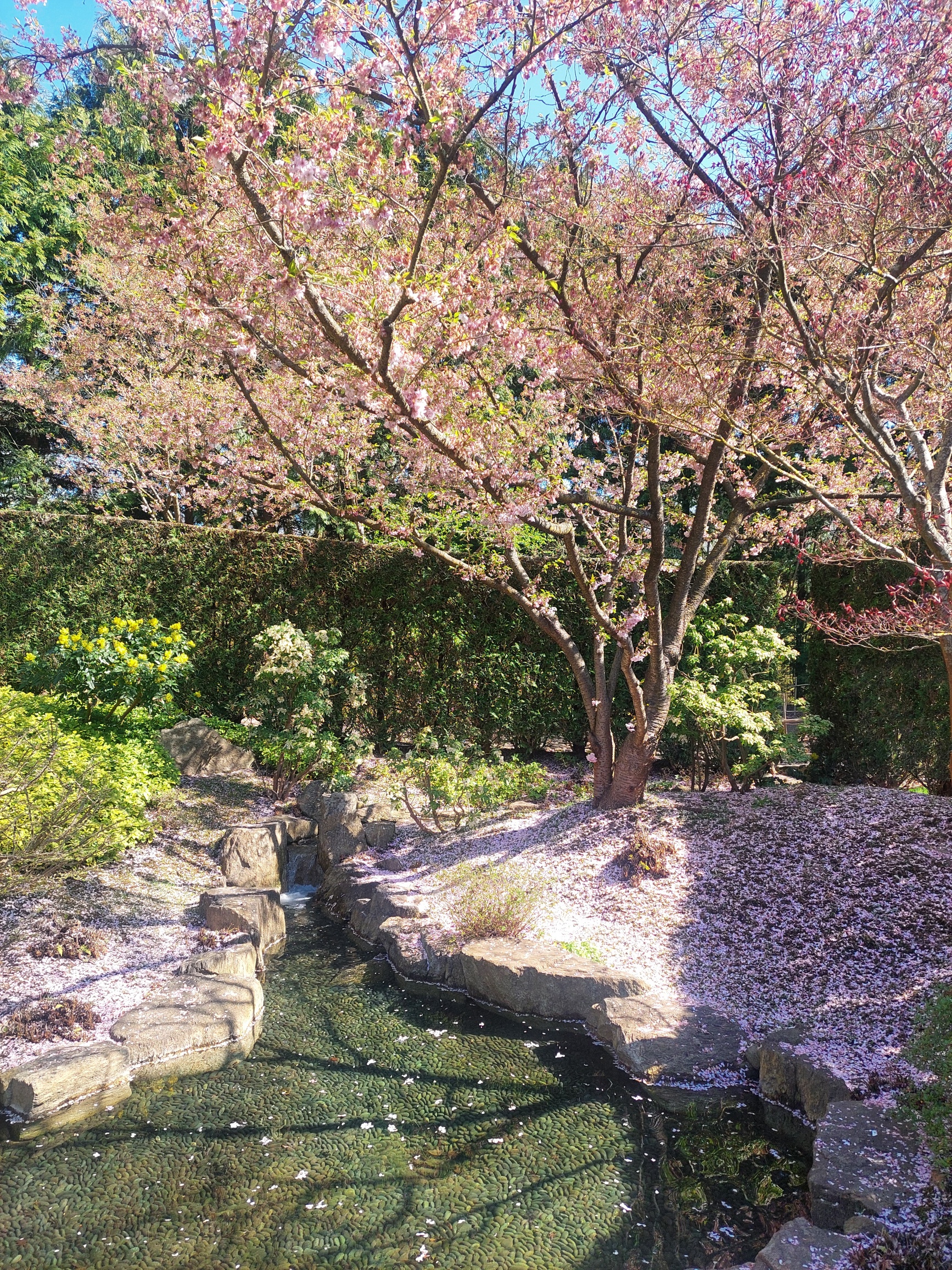 Marzahn. Gärten der Welt. Hier der japanische Garten zur Zeit der aktuellen Kirschblüte. Ein zartweißrosa Schleier von Blüten rieselte sanft vor strahlend blauem Himmel zu Boden. Die Gärten aus verschiedenen asiatischen Kulturen mit ihren klaren, klassischen Strukturen versetzten mich in eine heitere, gelassene Stimmung. Harmonie und Frieden, eine Naturmeditation, wie ich sie sonst nur am Meer mit seiner Weite empfinde.