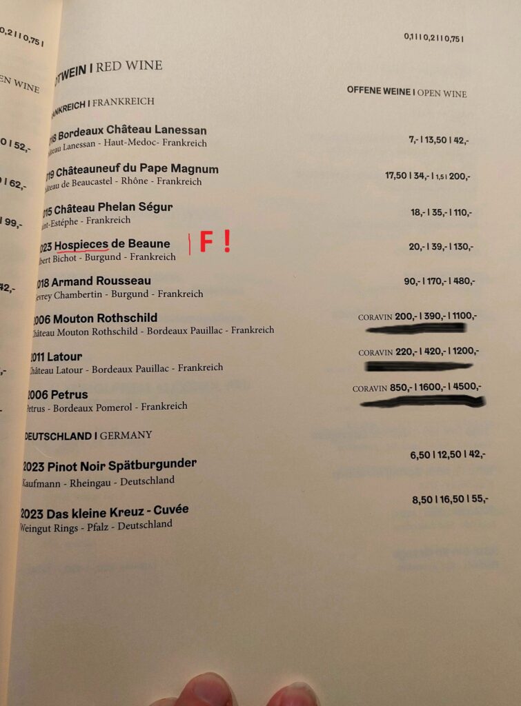 Wobei ich bezweifle, dass der Petrus 42,5mal besser schmeckt als der Beaune, wie der Preis es insinuiert. Peinlich in dem Zusammenhang nur, dass es auf der Karte heißt: Hospieces. Richtig muss es heißen, und das weiß natürlich jeder Weintrinker, der auch nur mal am Amselfelder genippt hat: Hospices. (Wenn überhaupt, müsste es heißen: Hospièces, mit Accent grave. Was natürlich jeder Klippschüler weiß.)