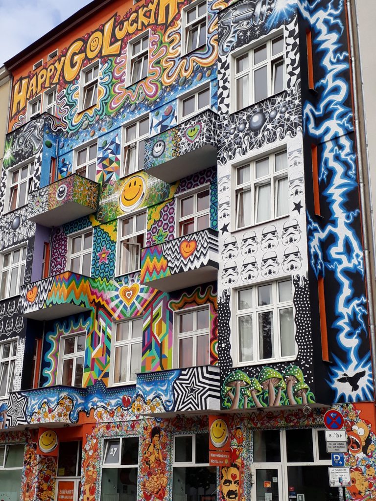 Fein, wenn vollgekiffte Alt-Hippies zu Wohlstand und Eigentum kommen und ihre Immobilien verschönern. Die Drogensymbolik an diesem Graffiti-Haus in Berlin-Charlottenburg ist nicht zu übersehen.