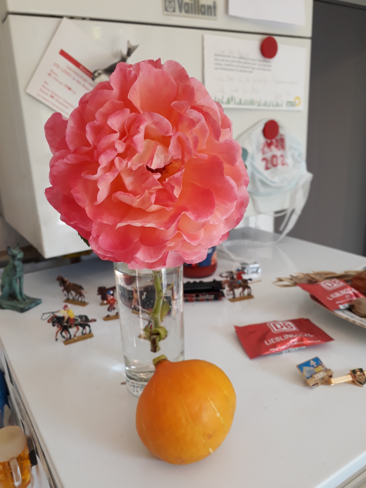 Kürbis und Rosen. Stilleben aus meinem Garten auf dem Kühlschrank. In Anlehnung an die Parole „Brot und Rosen“ der Gewerkschafts- und Frauenbewegung. Seit gefühlten Jahrzehnten kochen die Mädels Kürbissuppe, schmeckt nach nix, außer da ist Kiloweise Ingwer und Möhre dran. Was ist nur aus der guten, alten Erbsensuppe geworden? Solchen und ähnlichen Kulturphänomen und gesellschaftlichen Wandlungen versuche ich in diesem Blog seit gefühlten Jahrzehnten auf die Spur zu kommen. Anhand von Beispielen aus verschiedenen Sphären, wie Politik anhand des Zerfalls der SPD, Kultur anhand von Sprachkonflikten und dem Niedergang des ehemaligen Proletariersports Fußball, aber auch Kunst. Immer verbunden mit dem „subjektiven Faktor“. Auch so ein Betroffenheits-Kampfbegriff aus der Entstehungszeit der Kürbissuppe in deutschen Mädelshaushalten.