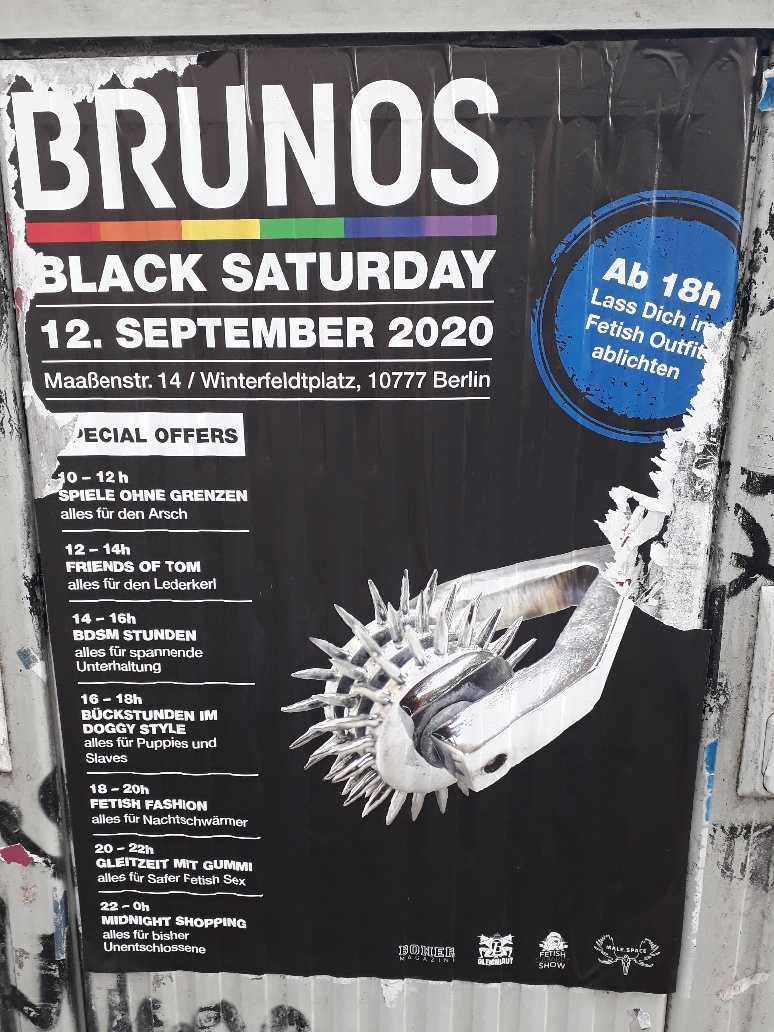 Eine feine Grundlage dafür ist das Staunen und ich staune des Öfteren in Berlin, mehr als woanders. Nicht nur bei obigem Plakat, das in Schöneberg zu Dutzenden klebt, bei dem ich in der Provinz, meint hier Hannover, geneigt gewesen wäre, einen Straftatbestand zu unterstellen, Erregung öffentlichen Ärgernisses oder so. Keine Ahnung, ich bin kein Jurist. Bin nur ein Flaneur aus der Provinz, der erstaunt und erfreut zur Kenntnis nimmt, dass das in Schöneberg zumindest keine*n juckt. Die dortige Gegend um den Winterfeldt-Platz ist ein komplett schwuler Kiez, dessen Codierungen zu dechiffrieren mir mit meiner heteronormativen Wahrnehmung mitunter schwer fällt. Vor diesem Plakat z. B. stand ich grübelnd und zog das Smartphone zur Hilfe.