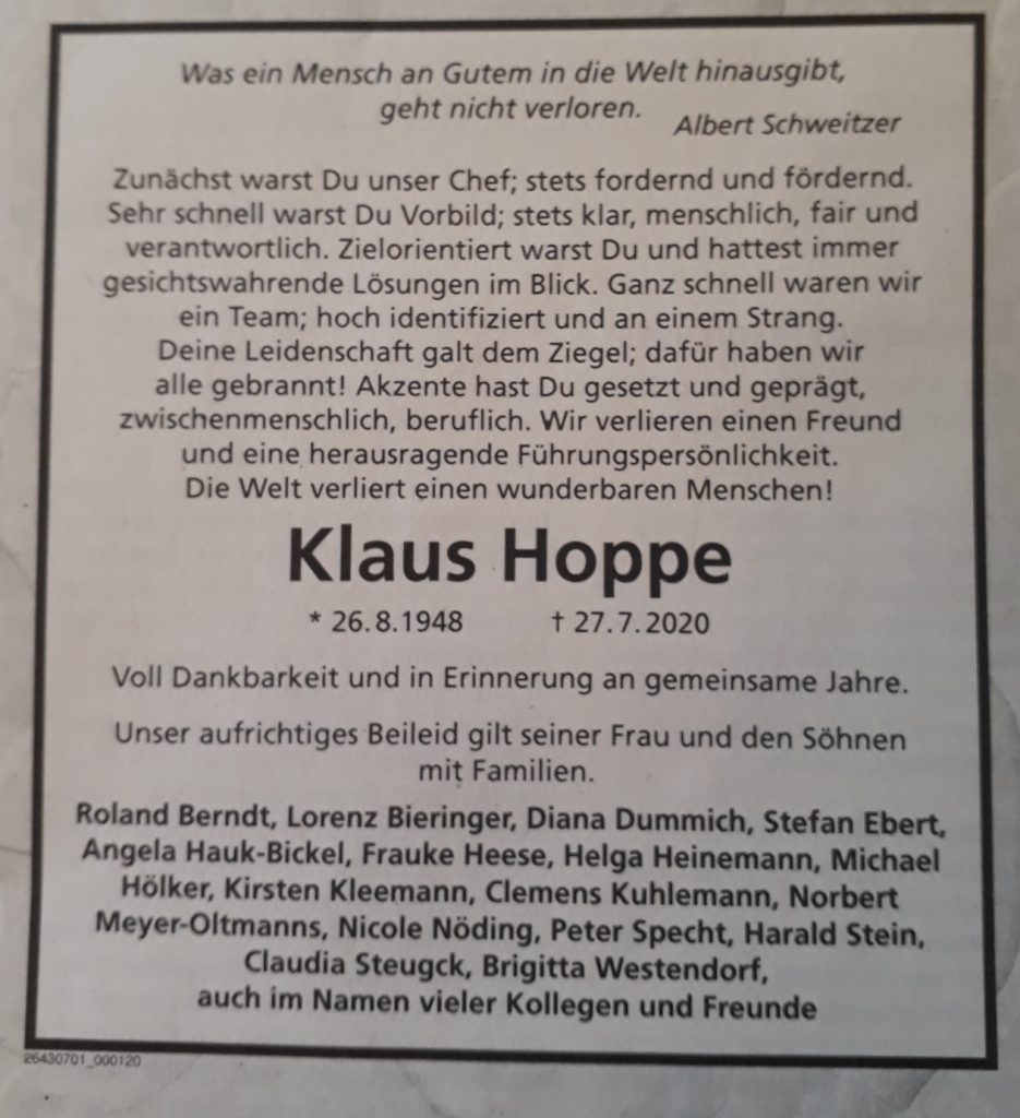 Vermutlich wurden die gebrannten Ziegel an den Köpfen dieser Tröpfe auf Bruchfähigkeit getestet. Man sieht es förmlich vor sich, wie dieser Albert Schweitzer des Brennwesens sich leidenschaftlich mit seinen Ziegeln im Bett wälzt, „fördernd und fordernd“. (Dieses Agenda-2010-Sprech in eine Todesanzeige zu pressen ist ebenso pathologisch wie bezeichnend für den Zustand unserer Gesellschaft).
