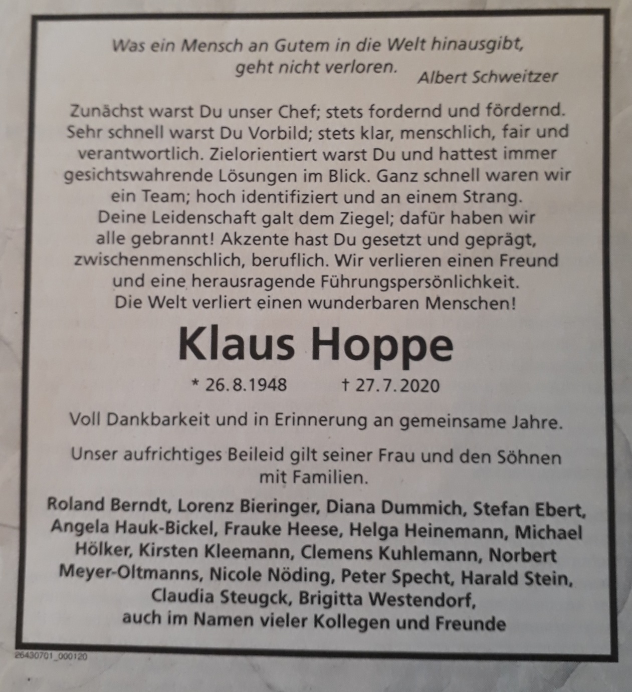 Dem Chef noch post mortem in den Arsch zu kriechen, zeugt von perfekter marktförmiger Abrichtung. Selten aber las ich so eine mich verstörende Todesanzeige wie diese. Jede Silbe ein abgefeimtes Marketing Blabla, das in einer wahren Apotheose der Grunzdummheit endet, bei deren Lektüre mir die Tränen kamen – vor Lachen: